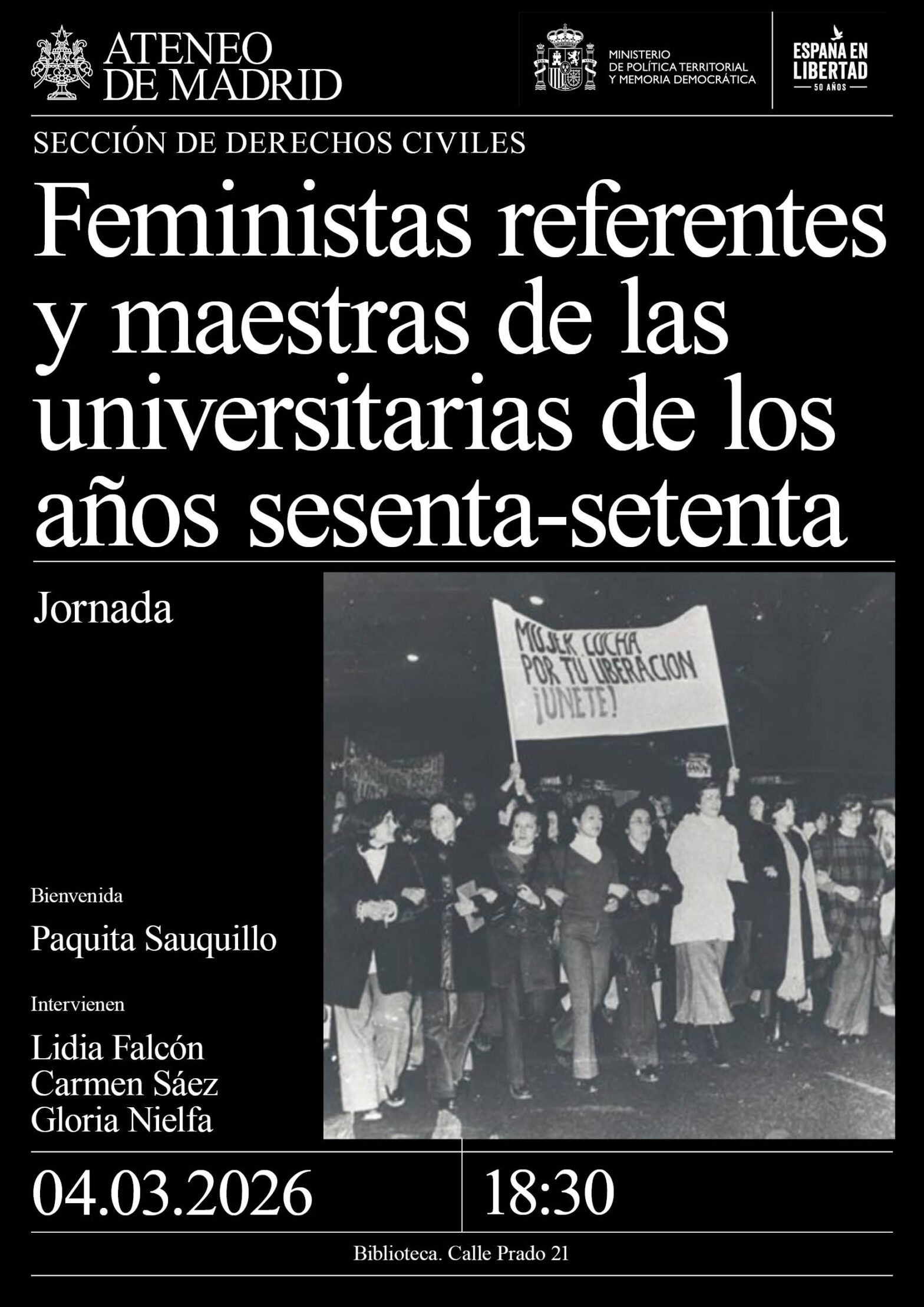 Sección de Derechos Civiles. Bienvenida: Paquita Sauquillo. Intervienen: Lidia Falcón, Carmen Sáez y Gloria Nielfa. Biblioteca. 18:30h.