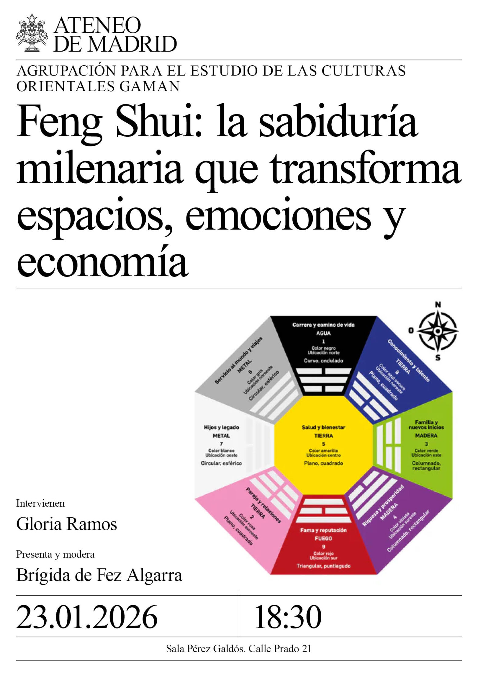 Agrupación para el estudio de las Culturas Orientales GAMAN. Interviene: Gloria Ramos, experta en Feng Shui clásico y metafísica china, fundadora de la Escuela Profesional de Feng Shui. Presenta y modera: Brígida de Fez Algarra. Sala Pérez Galdós. 18:30h.