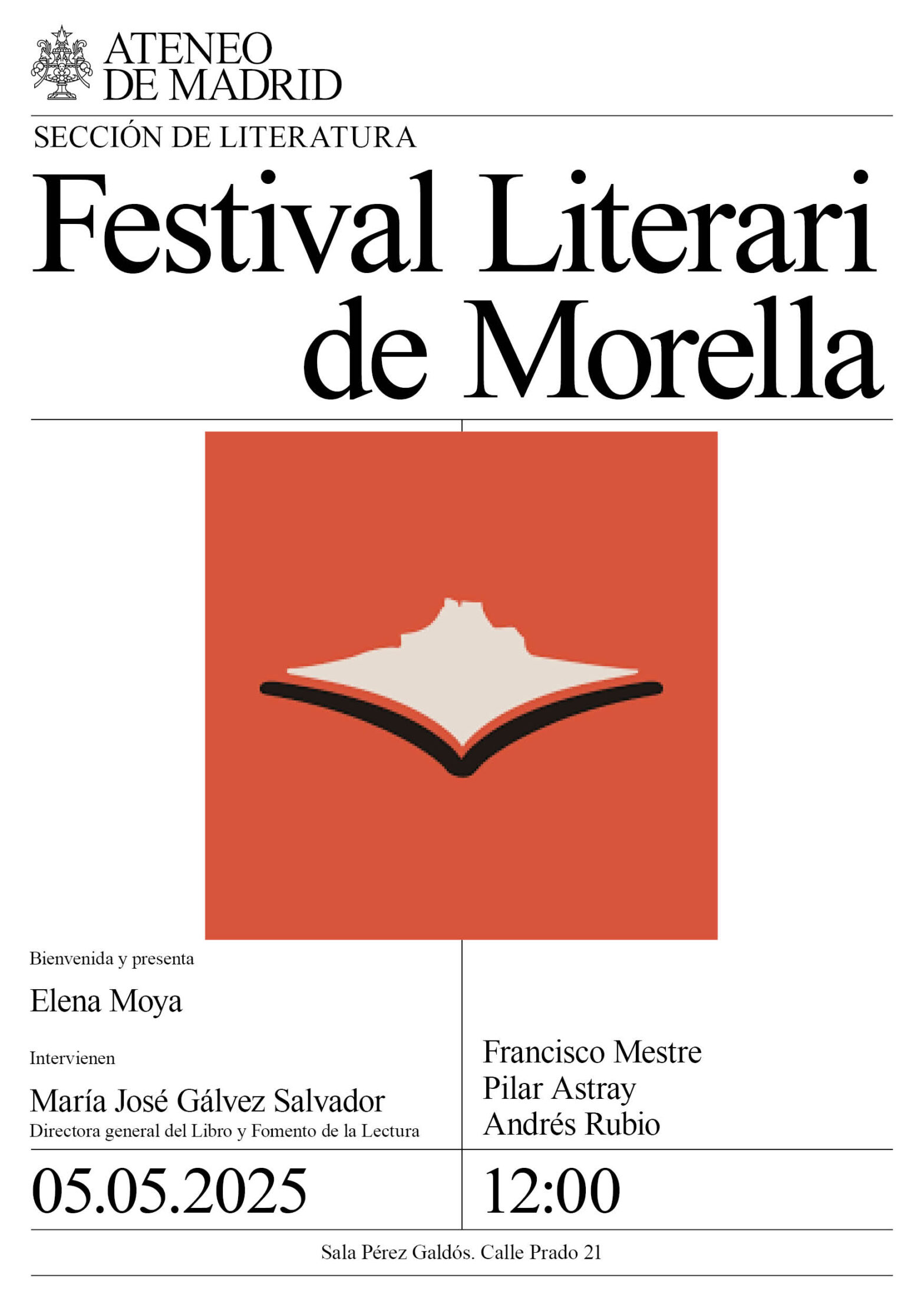 Sección de Literatura. Bienvenida y presenta: Elena Moya, directora del FLIM y novelista. Intervienen: María José Gálvez Salvador, directora general del Libro y Fomento de la Lectura; Francisco Mestre, presidente Los Pueblos Más Bonitos de España; Pilar Astray, poeta, artista, escritora, participante en el FLIM; Andrés Rubio, autor y participante en el FLIM. Sala Pérez Galdós. 12:00h.