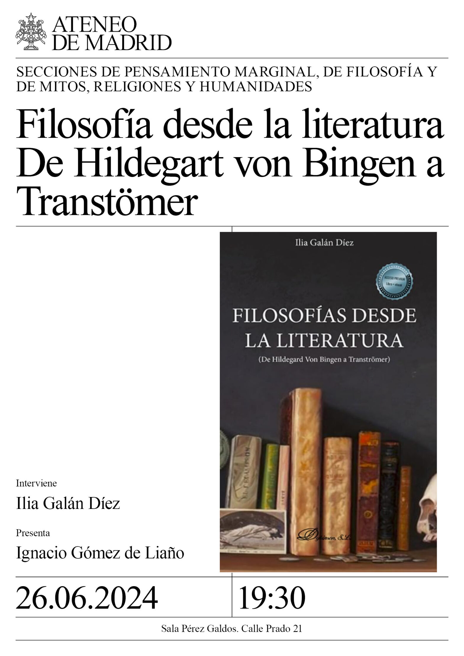 Secciones de Pensamiento Marginal, de Filosofía y de Mitos y de Religiones y Humanidades. Interviene: Ilia Galán Díez, autor, filósofo, poeta y profesor titular de Estética y Teoría del Arte en la Universidad Carlos III. Presenta: Ignacio Gómez de Liaño. Sala Pérez Galdós. 19:30h.