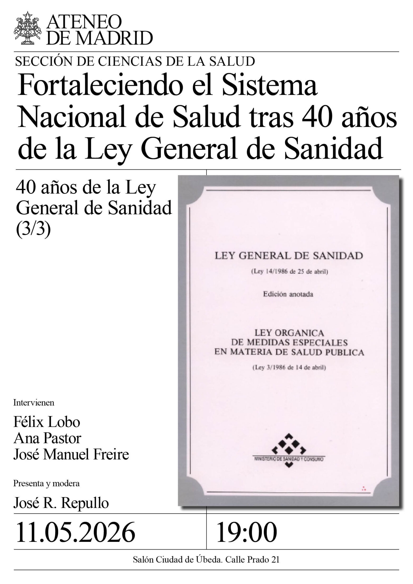 Sección de Ciencias de la Salud. 40 años de la Ley General de Sanidad (3/3). Intervienen: Félix Lobo, economista de la salud, catedrático profesor emérito, UC3M, Ana Pastor, médica, exministra de sanidad; y José Manuel Freire. Presenta y modera: José R. Repullo. Salón Ciudad de Úbeda. 19:00h.