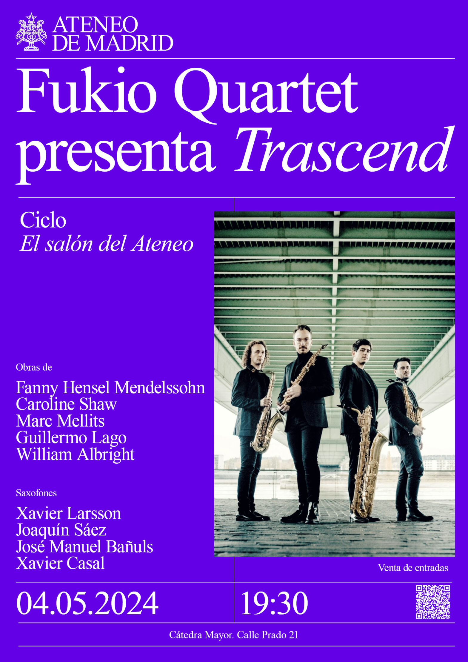 El reconocido cuarteto de saxofones Fukio Quartet nos presentará el 4 de mayo a las 19:30h su programa titulado «Trascend», con obras de Fanny Mendelssohn, Shaw, Mellits, Lago y Albright.