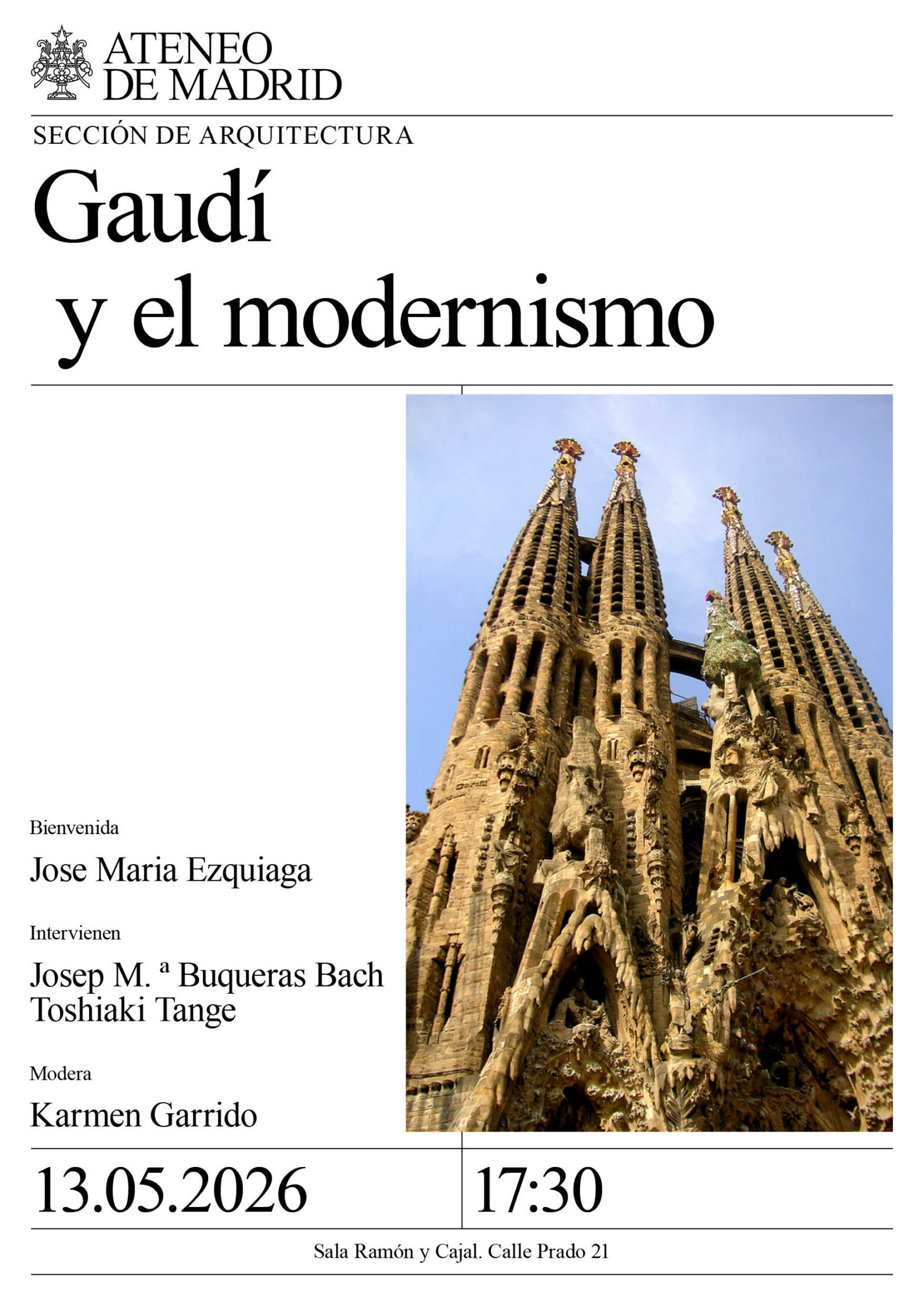 Sección de Arquitectura. Bienvenida: Jose Maria Ezquiaga. Intervienen: Josep M. ª Buqueras Bach, presidente Fundación TRENCADÍS; y Toshiaki Tange, arquitecto y estudioso de Gaudí. Modera: Karmen Garrido, presidenta de FEPET. Sala Ramón y Cajal. 17:30h.