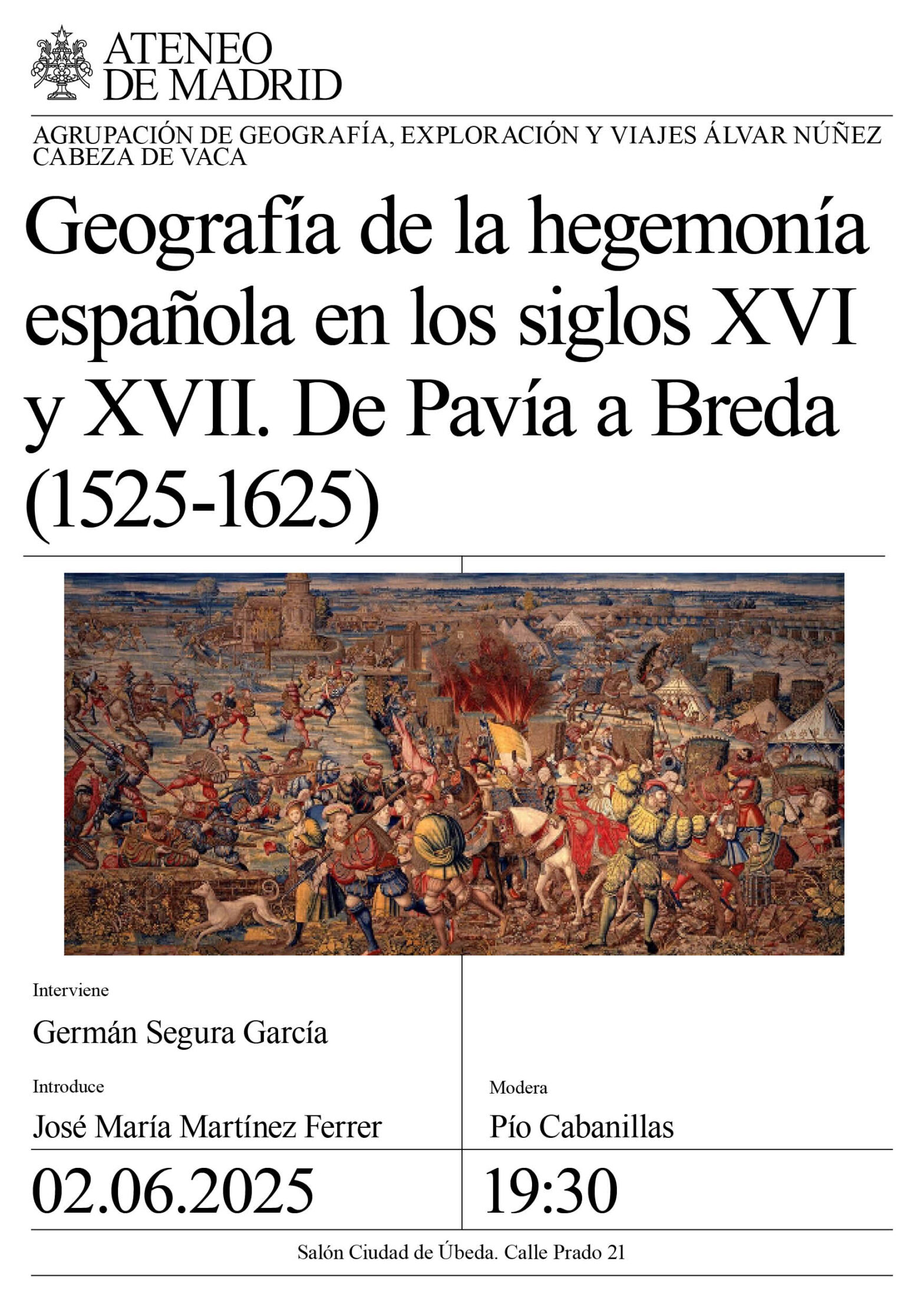 Agrupación Geografía, exploración y viajes Álvar Núñez Cabeza de Vaca. Interviene Germán Segura García, teniente coronel, doctor en Historia Moderna, actual profesor en el Centro Universitario de la Defensa, autor de numerosas publicaciones y reconocido experto en Historia militar. Introduce José María Martínez Ferrer, subdirector de Estudios Históricos del Instituto de Historia y Cultura Militar. Modera Pío Cabanillas. Salón Ciudad de Úbeda. 19:30h.