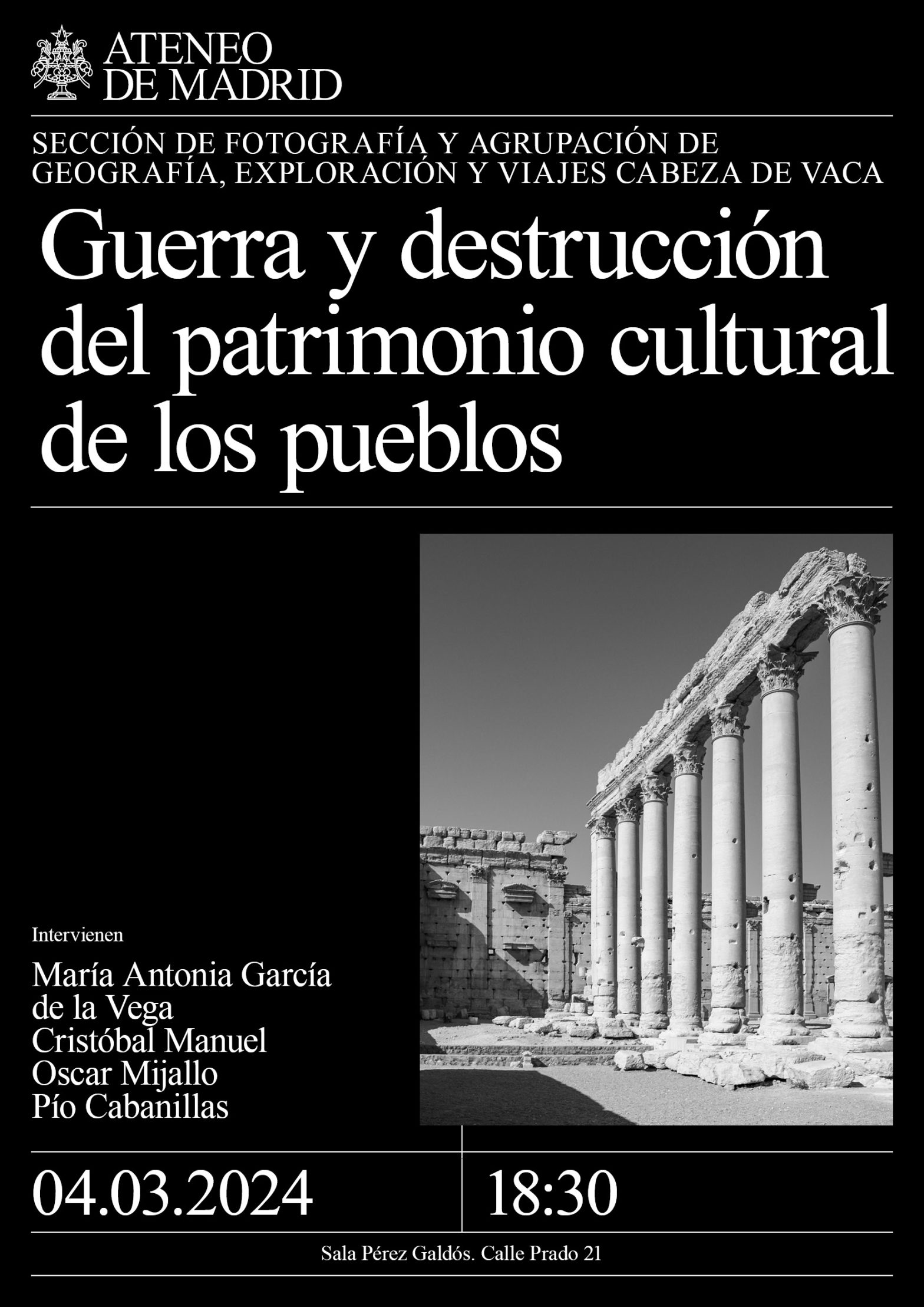 Sinopsis: La charla se enfoca a partir del libro ”Siria” de Pío Cabanillas y de la exposición del mismo título que se presenta en el Ateneo a continuación de la charla. En tiempos de brutales conflictos como los que vivimos en Ucrania y Oriente Próximo, y ante las enormes pérdidas en vidas y en legado artístico, se toma Siria como ejemplo y referencia, intentando contribuir a que la barbarie nunca borre de la memoria la grandeza de los pueblos y de las civilizaciones. Se trata, de un homenaje a la paz, a la belleza, y una reflexión sobre la pérdida y el carácter inmaterial de la cultura. Un homenaje al resplandor de la creatividad humana cuyo legado trasciende la pérdida material para integrarse como parte imprescindible de la identidad cultural no sólo de los pueblos masacrados, sino de toda la humanidad.