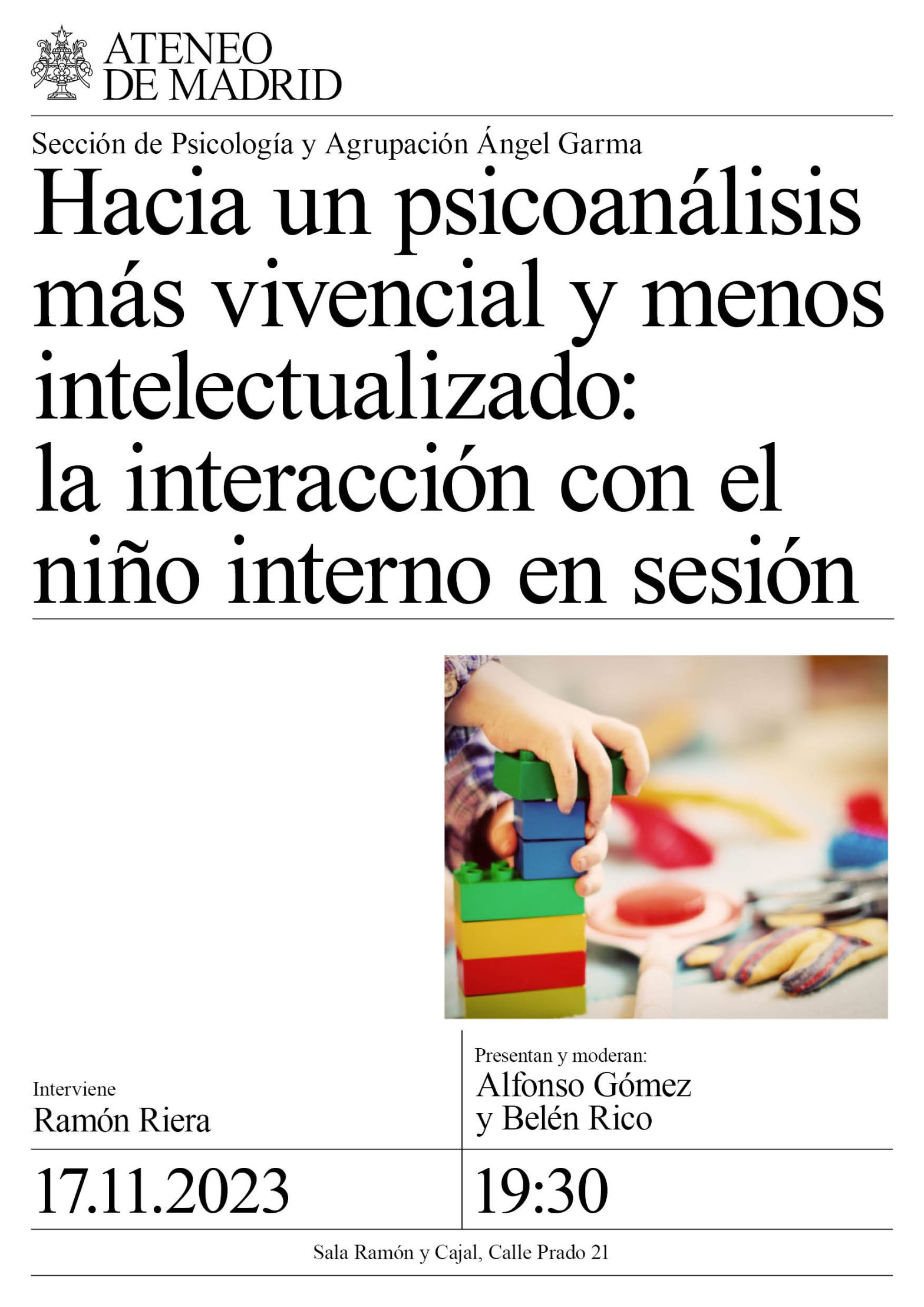 Sección de Psicología y Agrupación Ángel Garma. Interviene Ramón Riera, psiquiatra y psicoanalista, presidente de honor de la Sección Española de la Asociación Internacional de Psicoanálisis y Psicoterapia Relacional. Presentan y moderan: Alfonso Gómez y Belén Rico. Sala Ramón y Cajal. 19:30h.