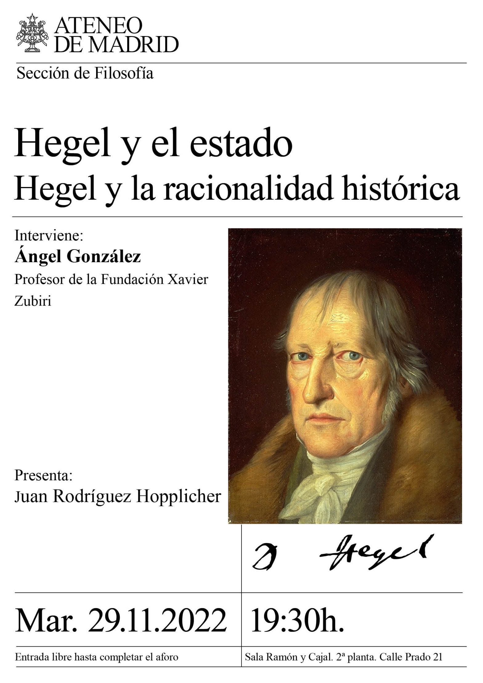 Sección de Filosofía. Hegel y el Estado. Hegel y la racionalidad histórica. Interviene Ángel González, profesor de la Fundación Xavier Zubiri. Presenta Juan Rodríguez Hoppichler. Sala Ramón y Cajal. 19.30 h.