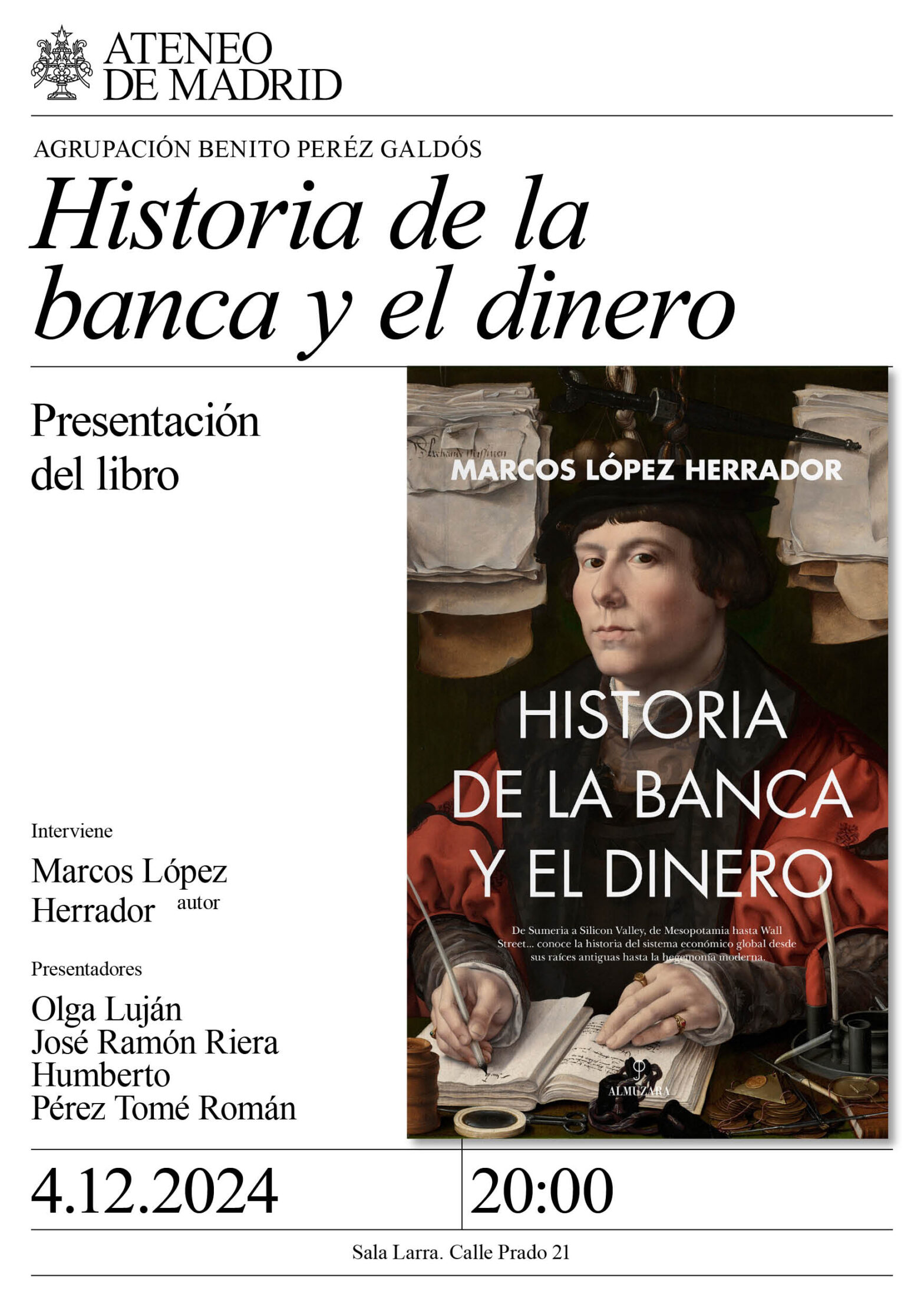 Agrupación Benito Pérez Galdós. Intervienen: Marcos López Herrador, autor; licenciado en Derecho, diplomado en Empresariales y en en Marketing Financiero. Presentan: Olga Luján, DUE, escritora, miembro de Escritores con la Historia y colaboradora habitual en prensa literaria; José Ramón Riera, economista y especialista en Gestión y Desarrollo de Negocios, delegado en General Electric Capital; y Humberto Pérez Tomé Román, editor de la Editorial Almuzara en su sello SEKOTIA. Sala Larra. 20:00h.