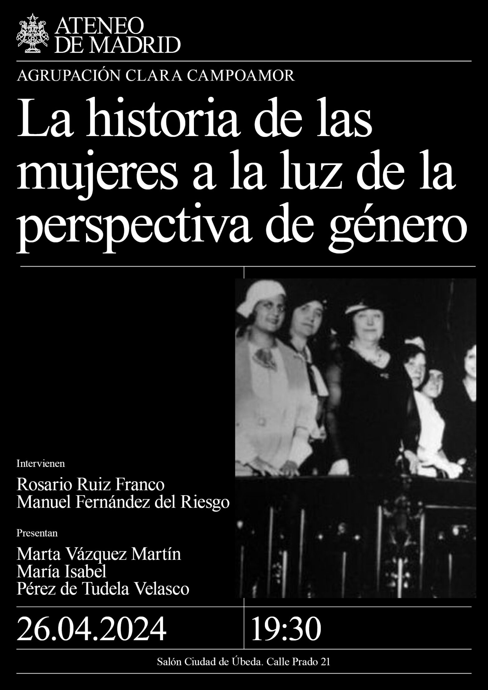 Agrupación Clara Campoamor. Intervienen: Rosario Ruiz Franco, profesora ayudante, doctor de Historia Contemporánea; y Manuel Fernández del Riesgo, profesor titular emérito de la Universidad Complutense. Presentan: Marta Vázquez Martín y María Isabel Pérez de Tudela Velasco. Salón Ciudad de Úbeda. 19:30h.