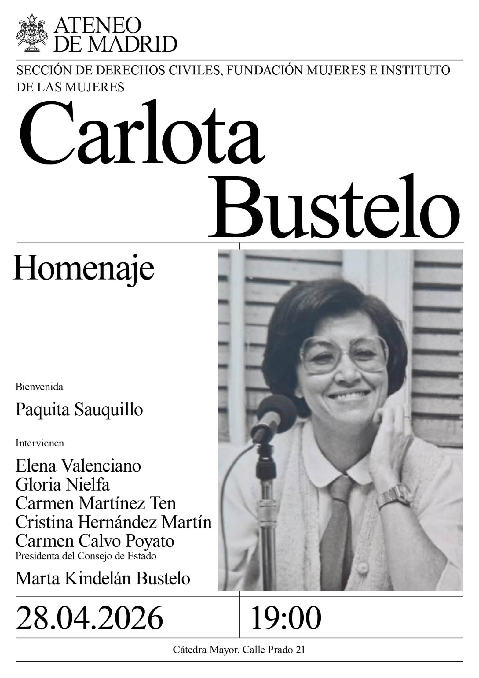 Sección de Derechos Civiles. Bienvenida: Paquita Sauquillo. Intervienen: Elena Valenciano, presidenta de la Fundación Mujeres; Gloria Nielfa, participó en el Frente de Liberación de la Mujer y es catedrática emérita de Historia Contemporánea en la Universidad Complutense de Madrid; Carmen Martínez Ten, coordinadora de la Tertulia Feminista de Madrid, sustituyó a Carlota Bustelo como directora del Instituto de la Mujer; Cristina Hernández Martín, directora del Instituto de las Mujeres de España; Carmen Calvo Poyato, presidenta del Consejo de Estado; y Marta Kindelán Bustelo, directora del Área de Medio Ambiente y Ordenación del Territorio en el Defensor del Pueblo; . Cátedra Mayor. 19:00h.
