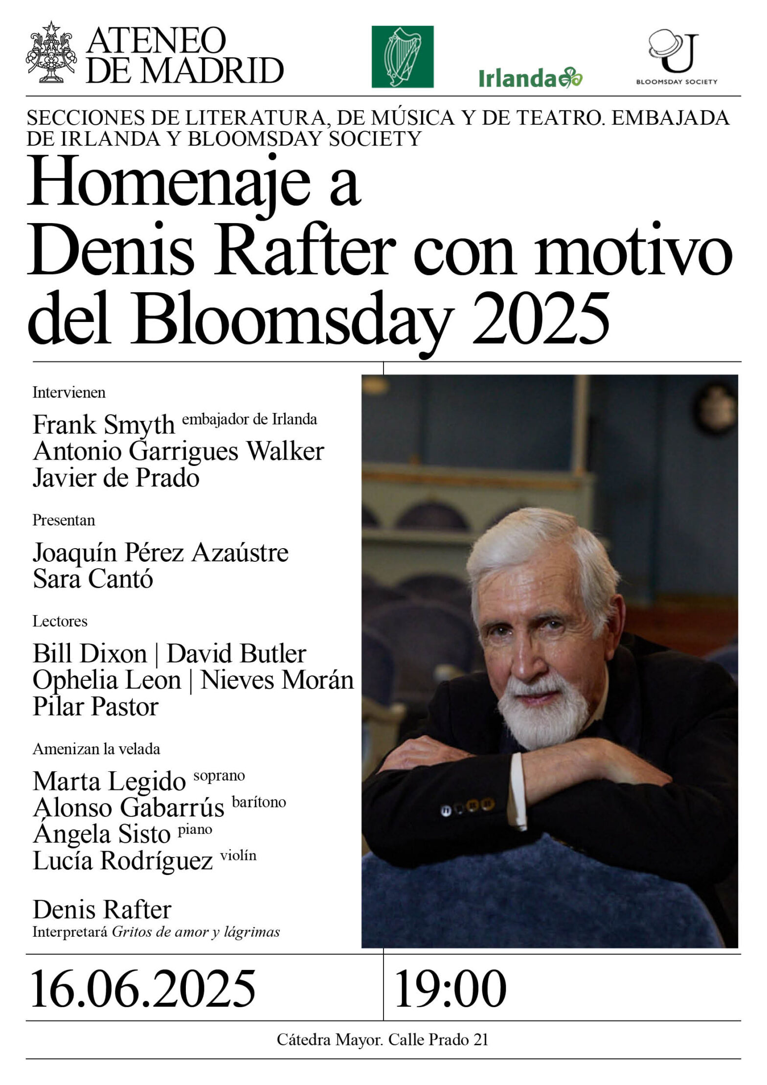Secciones de Literatura, de Música y de Teatro. Embajada de Irlanda y Bloomsday Society. Intervienen: Frank Smyth, embajador de Irlanda; Antonio Garrigues Walker y Javier de Prado. Presentan: Joaquín Pérez Azaústre y Sara Cantó. Lectores: Bill Dixon, David Butler, Ophelia Leon, Nieves Morán y Pilar Pastor. Amenizan la velada: Marta Legido, soprano y Alonso Gabarrús, barítono, de la Escuela Superior de Canto de Madrid; Ángela Sisto, pianista y Lucía Rodríguez, violinista, de Musical Arts. Denis Rafter interpretará Gritos de amor y lágrimas. Cátedra Mayor. 19:00h.