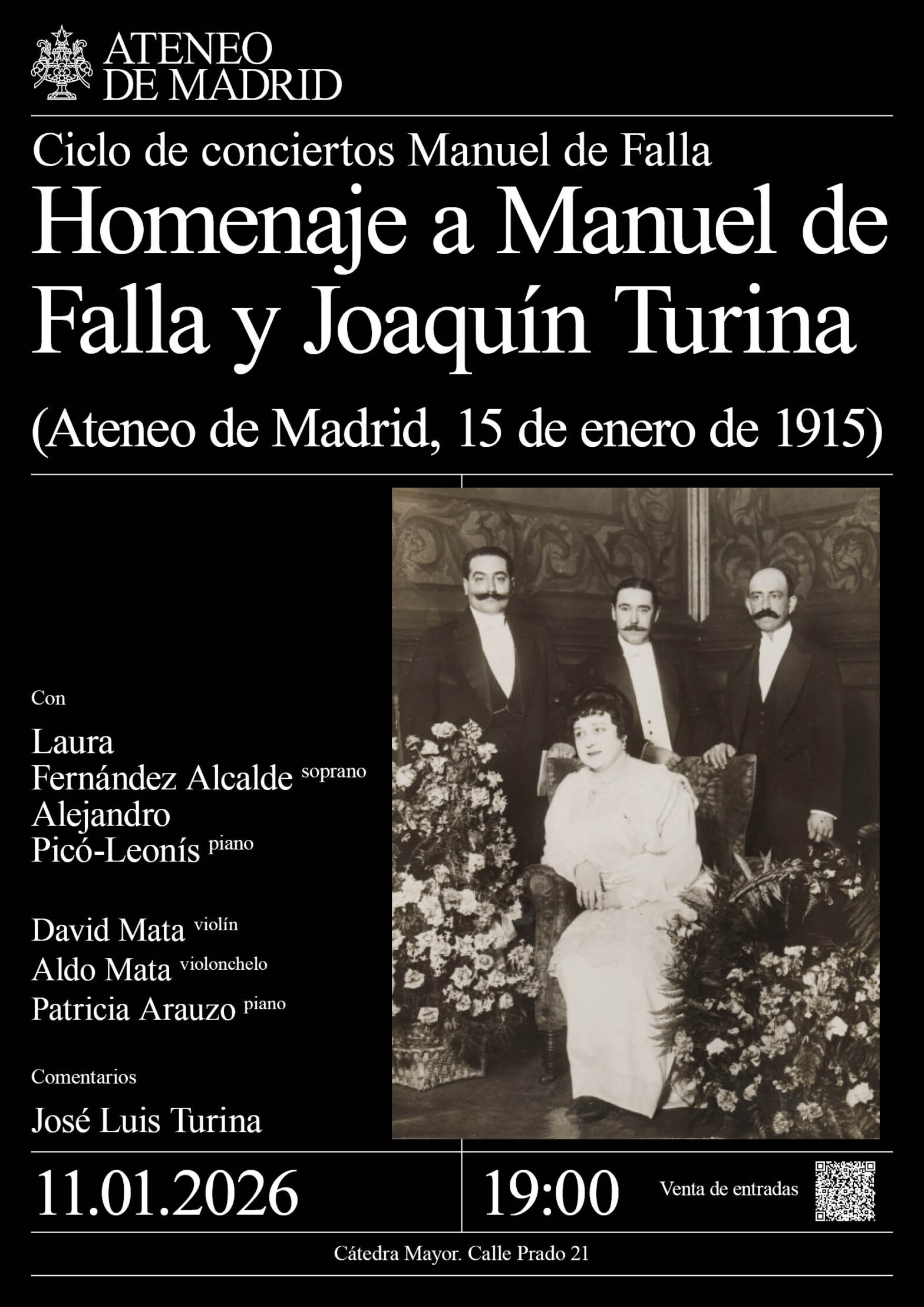 El 15 de enero de 1915, el Ateneo de Madrid brindó un homenaje conjunto a Manuel de Falla y Joaquín Turina, que acababan de llegar de París, en el cual se estrenaron las Siete Canciones Populares Españolas con Luisa Vela y Manuel de Falla al piano. Dedicaremos este recital a rememorar ese evento.