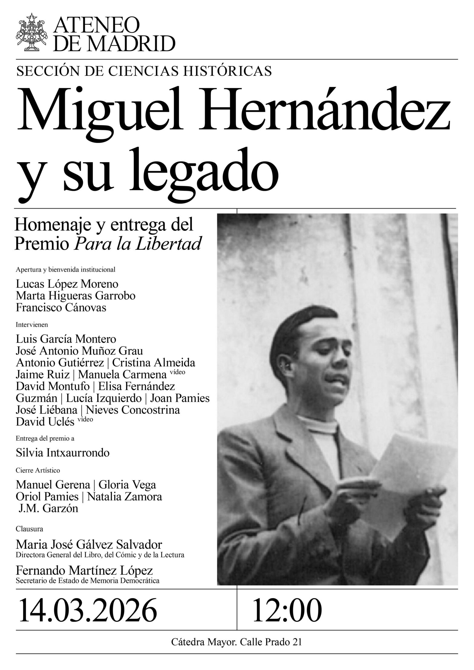 Intervienen: Luis García Montero, poeta y director del Instituto Cervantes; José Antonio Muñoz Grau, escritor y estudioso Hernandiano; Antonio Gutiérrez, exsecretario general CCOO y exdiputado; Cristina Almeida, abogada y activista social; Jaime Ruiz, presidente de AMESDE y miembro de Tu pueblo y el Mio; y Manuela Carmena, exalcaldesa de Madrid, intervención por vídeo. Cierre artístico: Manuel Gerena interpretará Nanas de la Cebolla
