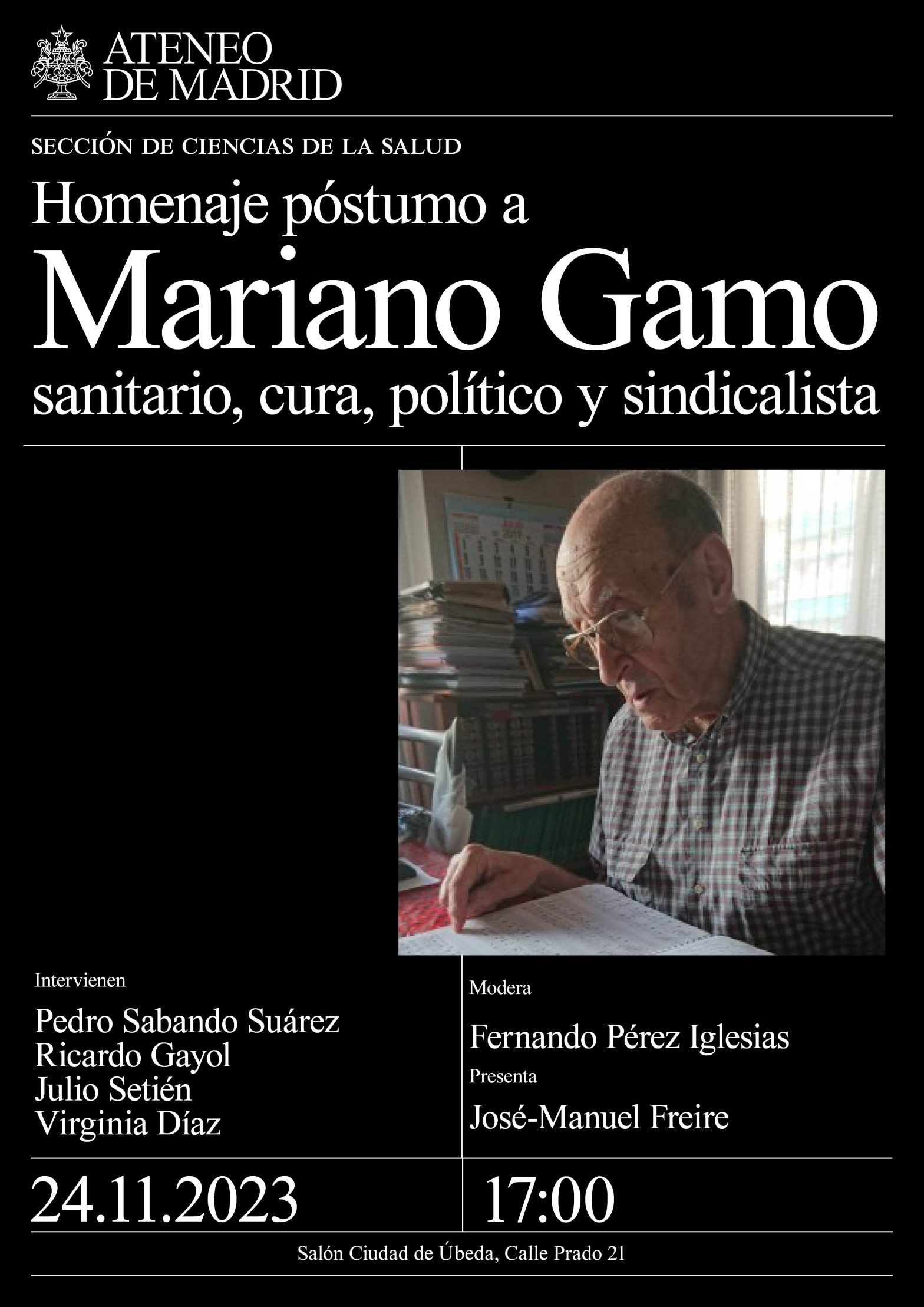 Sección de Ciencias de la Salud. Intervienen: Pedro Sabando Suárez, médico, subsecretario del primer Ministerio de Sanidad del gobierno del Partido Socialista, exconsejero de Sanidad de Madrid y amigo de Mariano. Ricardo Gayol, compañero y colaborador de Mariano en los años 60 y 70 desde los grupos cristianos de base. Julio Setién, exdiputado de IU y compañero de Mariano en el grupo parlamentario. Virginia Díaz, exdiputada de IU Madrid y compañera de Mariano en el grupo parlamentario. Modera: Fernando Pérez Iglesias, medico y sindicalista, compañero de Mariano en el trabajo. Presenta: José-Manuel Freire. Salón Ciudad de Úbeda. 17h.