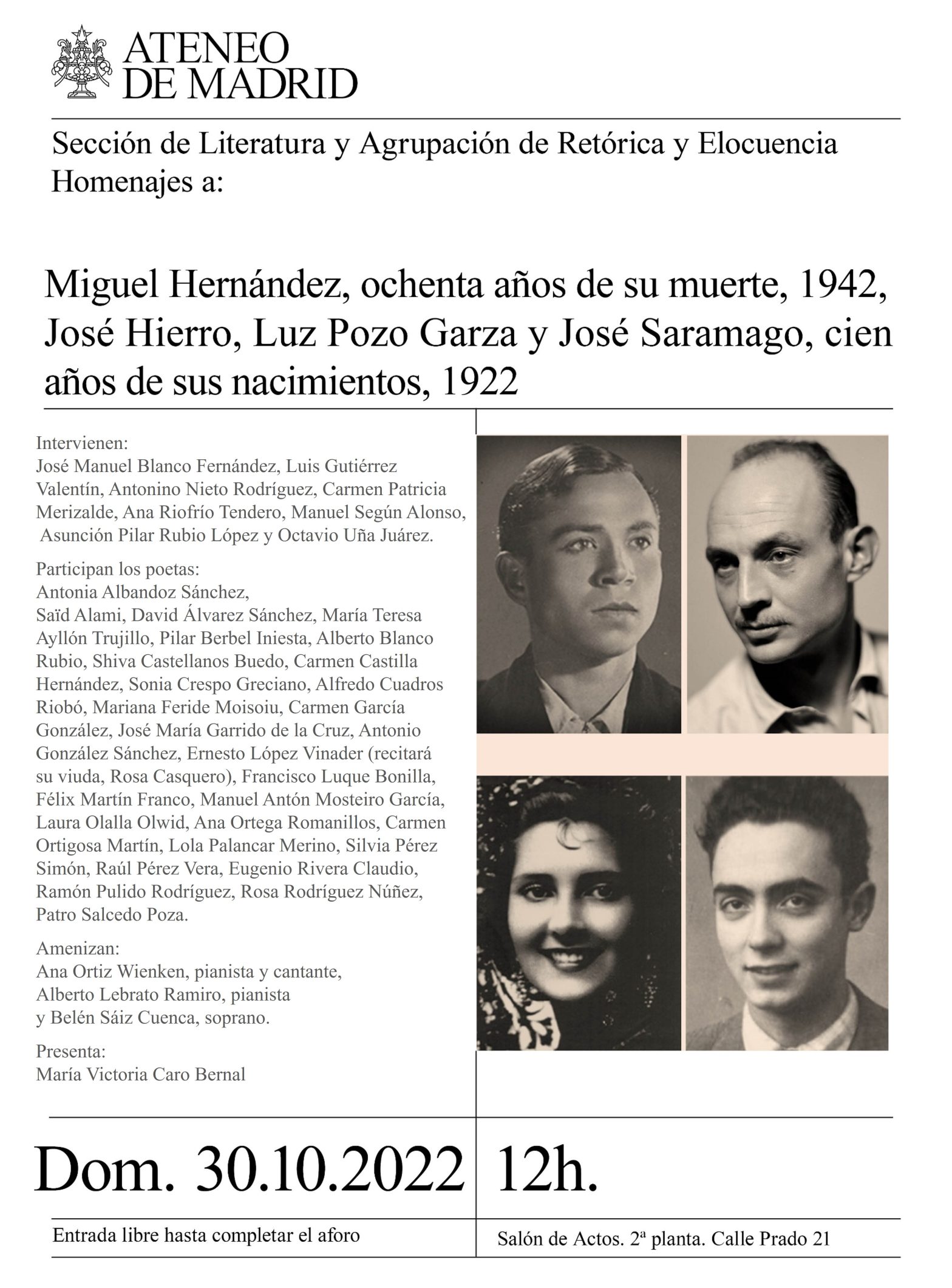 Sección de Literatura y Agrupación de Retórica y Elocuencia. Homenajes a: Miguel Hernández, ochenta años de su muerte, 1942, José Hierro, Luz Pozo Garza y José Saramago, cien años de sus nacimientos, 1922. Participan los poetas: Antonia Albandoz Sánchez, Saïd Alami, David Álvarez Sánchez, María Teresa Ayllón Trujillo, Pilar Berbel Iniesta, Alberto Blanco Rubio, Shiva Castellanos Buedo, Carmen Castilla Hernández, Sonia Crespo Greciano, Alfredo Cuadros Riobó, Mariana Feride Moisoiu, Carmen García González, José María Garrido de la Cruz, Antonio González Sánchez, Ernesto López Vinader (recitará su viuda, Rosa Casquero), Francisco Luque Bonilla, Félix Martín Franco, Manuel Antón Mosteiro García, Laura Olalla Olwid, Ana Ortega Romanillos, Carmen Ortigosa Martín, Lola Palancar Merino, Silvia Pérez Simón, Raúl Pérez Vera, Eugenio Rivera Claudio, Ramón Pulido Rodríguez, Rosa Rodríguez Núñez, Patro Salcedo Poza. Amenizan: Ana Ortiz Wienken, pianista y cantante, Alberto Lebrato Ramiro, pianista y Belén Saiz Cuenca, soprano. Presenta: María Victoria Caro Bernal. Salón de Actos. A las 12:00 del mediodía.