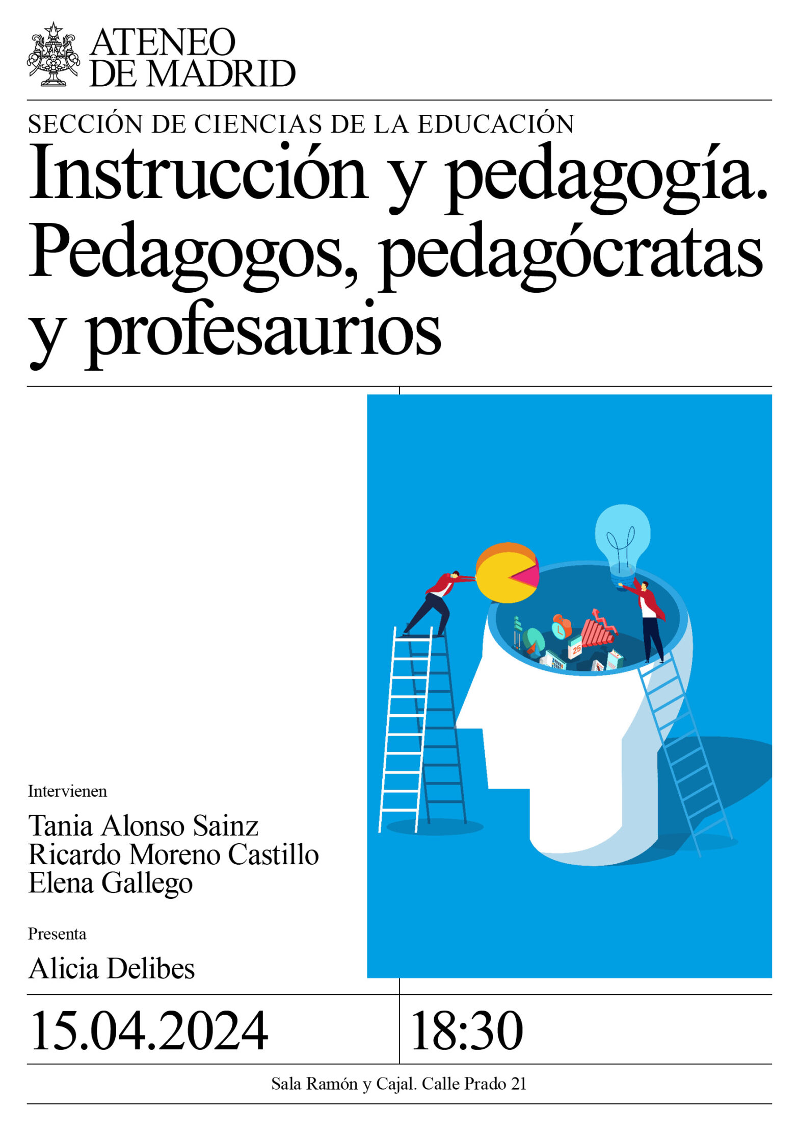 Sección de Ciencias de la Educación. Intervienen: Tania Alonso Sainz, profesora de Filosofía de la Educación en la UCM; Ricardo Moreno Castillo, licenciado en Matemáticas y Filosofía. Catedrático de instituto y profesor asociado en la Facultad de Matemáticas de la Universidad Complutense; y Elena Gallego, Fundación Menéndez Pidal. Presenta: Alicia Delibes. Sala Ramón y Cajal. 18:30h.