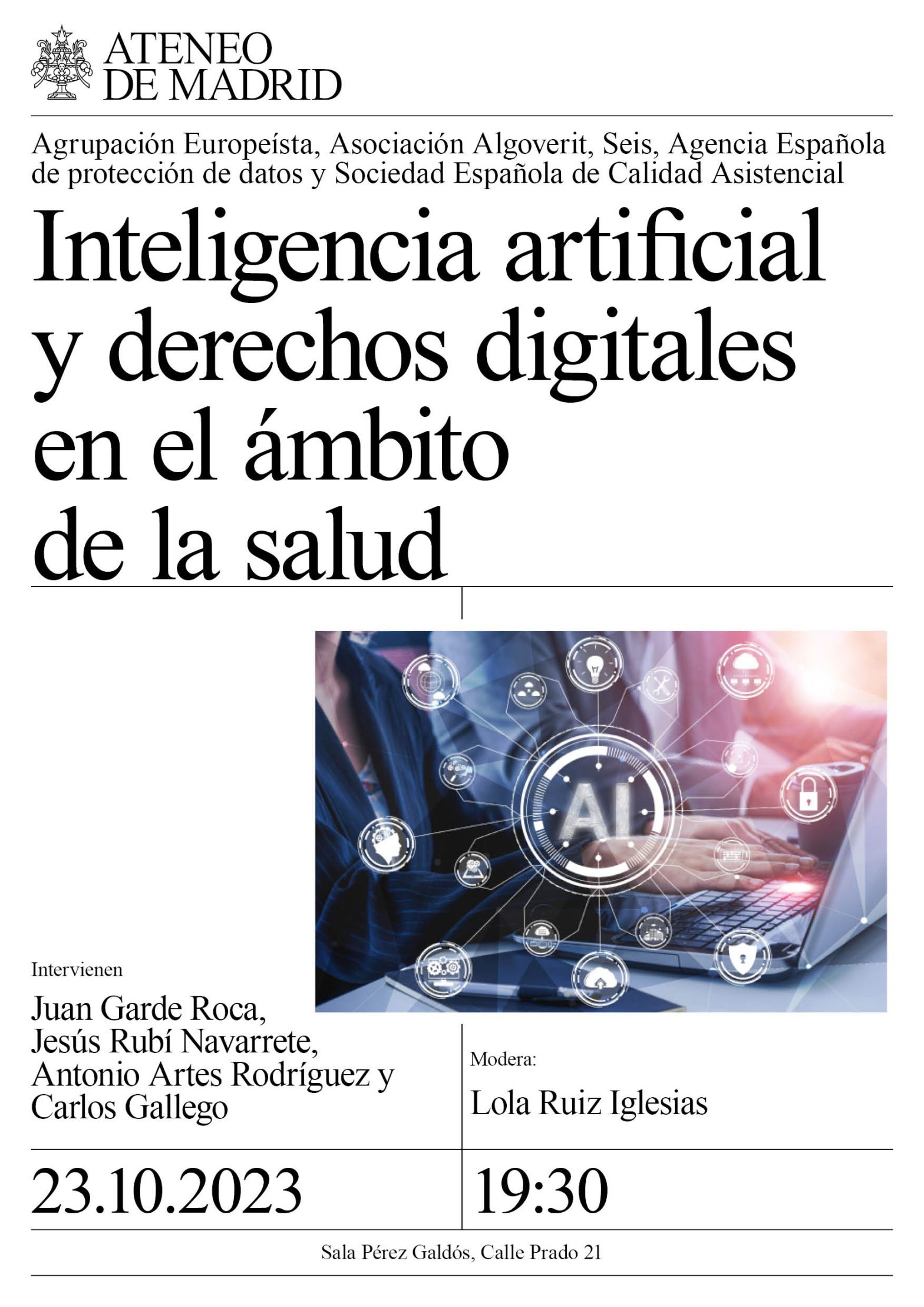 Agrupación Europeísta, Asociación Algoverit, Seis, Agencia Española de protección de datos y Sociedad Española de Calidad Asistencial. Intervienen: Juan Garde Roca, economista. Jesús Rubí Navarrete, abogado, adjunto a la Dirección de la Agencia Española de Protección de Datos, ex director del Gabinete del Ministro de Justicia, ex secretario general técnico del Ministerio de Relaciones con las Cortes. Antonio Artes Rodríguez, doctor ingeniero de Telecomunicaciones, catedrático del Departamento de Teoría de la Señal y Comunicaciones de la Universidad Carlos III de Madrid. Carlos Gallego. Modera: Lola Ruíz Iglesias, doctora, experta en innovación y transformación sanitaria y desarrollo de servicios integrados de atención comunitaria. Sala Pérez Galdós. 19:30h.
