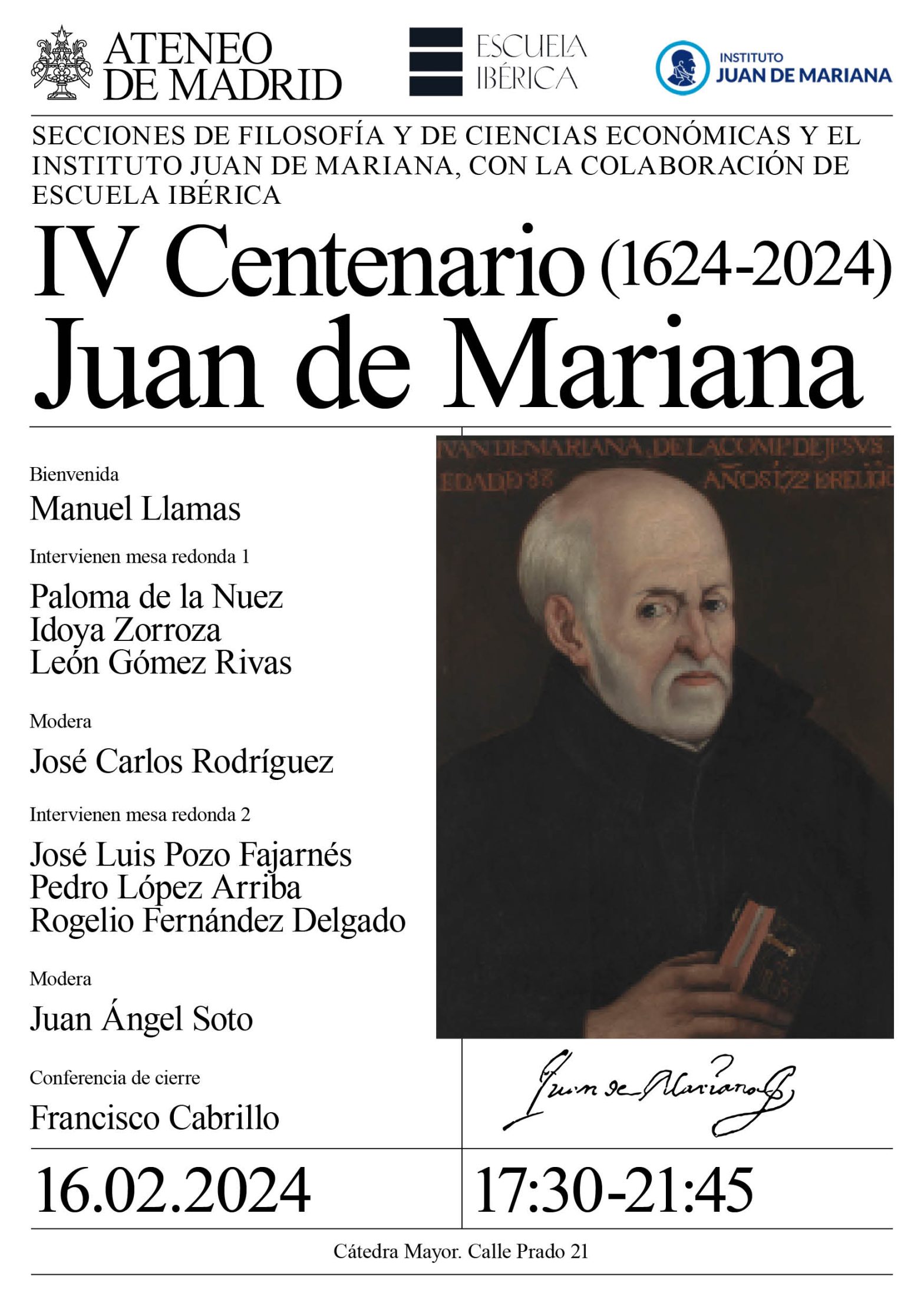 17:45-19:15 Mesa redonda: Filosofía y pensamiento de Juan de Mariana. Modera: José Carlos Rodríguez (Instituto Juan de Mariana). Ponentes: Paloma de la Nuez (Universidad Rey Juan Carlos), Idoya Zorroza (Universidad Pontificia de Salamanca y Escuela Ibérica), León Gómez Rivas (Universidad Europea de Madrid, Centro Diego de Covarrubias y Escuela Ibérica)