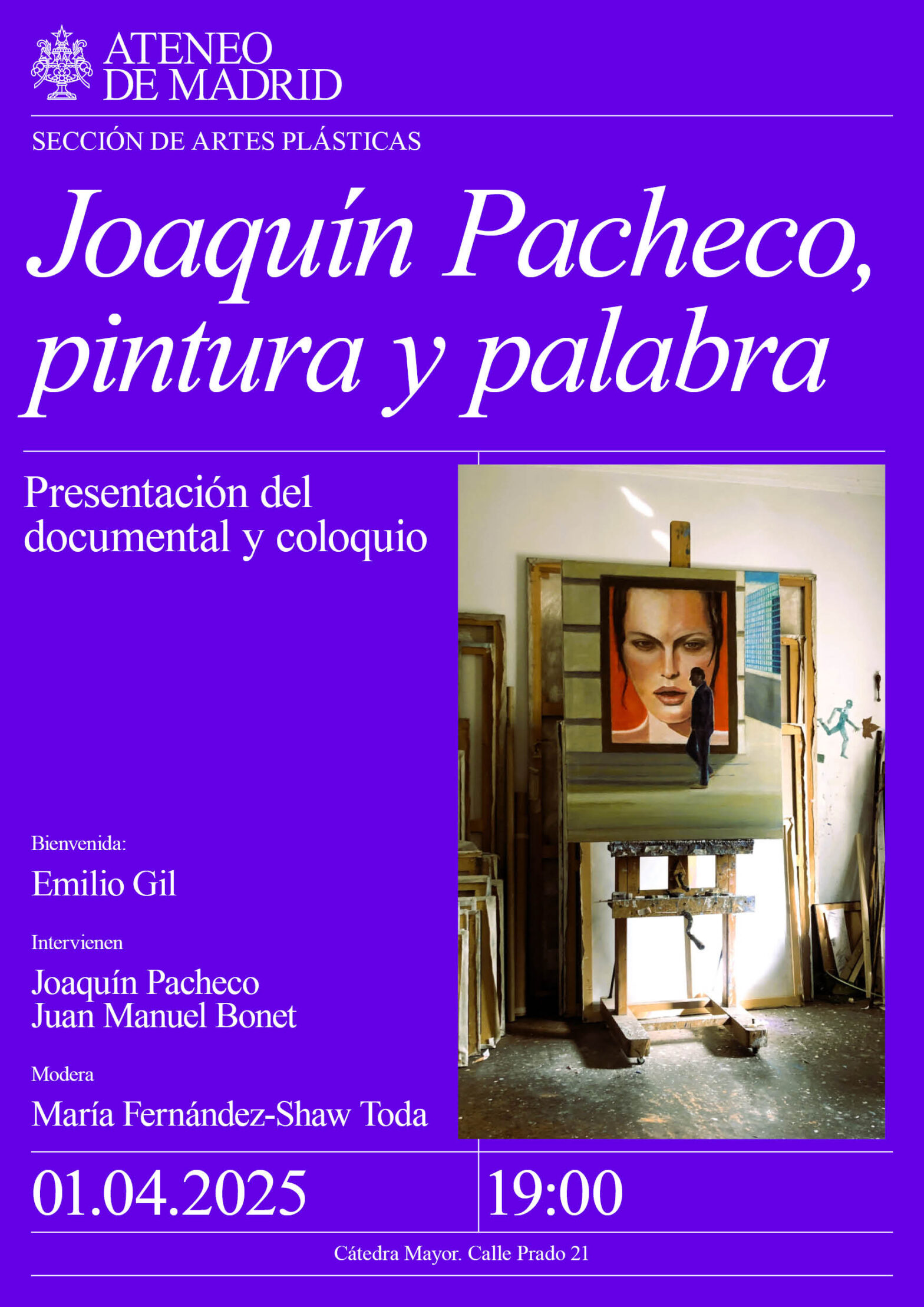Sección de Artes Plásticas. Bienvenida: Emilio Gil. Intervienen: Joaquín Pacheco y Juan Manuel Bonet. Modera María Fernández-Shaw Toda. Cátedra Mayor. 19:00h.