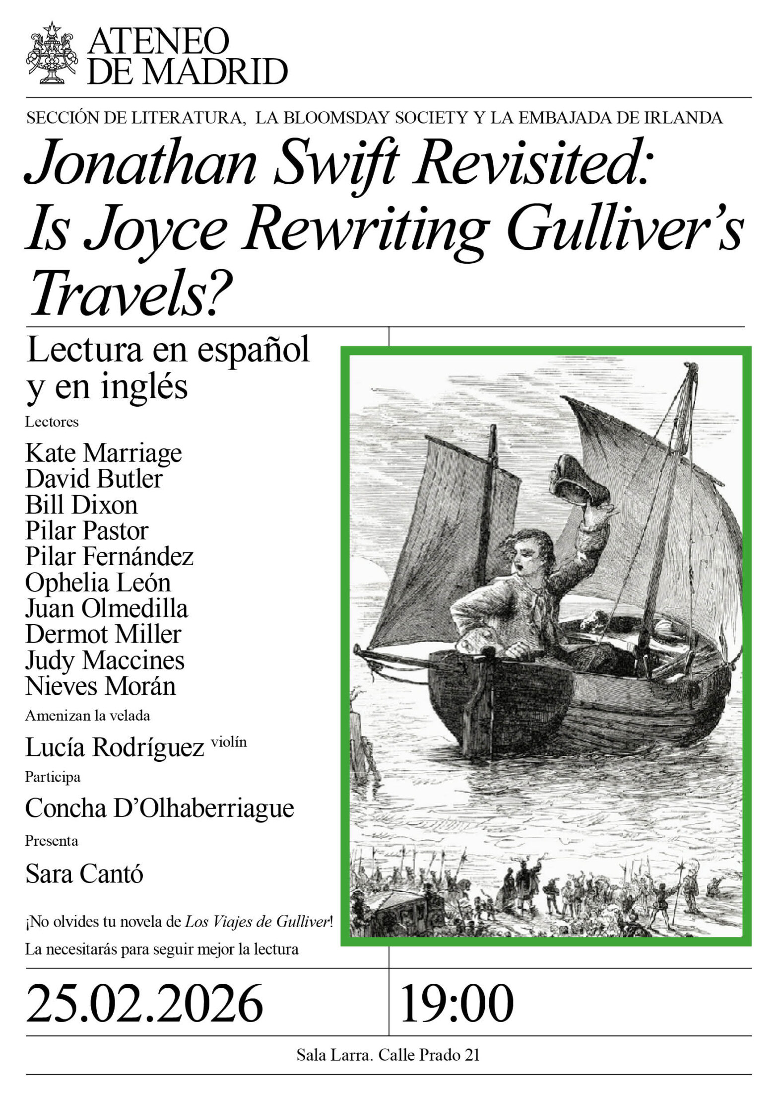 Sección de Literatura, la Bloomsday Society y la Embajada de Irlanda. Lectores: Kate Marriage, David Butler, Bill Dixon, Pilar Pastor, Pilar Fernández, Ophelia León, Juan Olmedilla, Dermot Miller, Judy Maccines y Nieves Morán. Amenizan la velada: Lucía Rodríguez, violín. Participa : Concha D’Olhaberriague. Presenta: Sara Cantó. ¡No olvides tu novela de Los Viajes de Gulliver! La necesitarás para seguir mejor la lectura. Sala Larra. 19:00h.