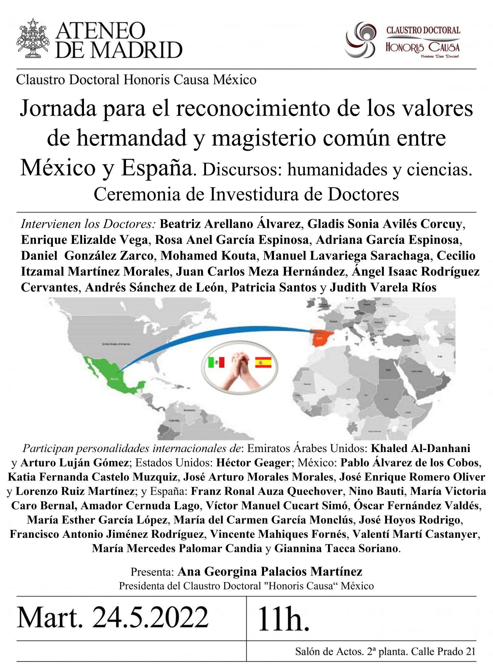 Ateneo de Madrid y Claustro Doctoral «Honoris Causa» de México. Jornada para el reconocimiento de los valores de hermandad y magisterio común entre México y España. Discursos sobre humanidades y ciencias. Ceremonia de Investidura de Doctores.