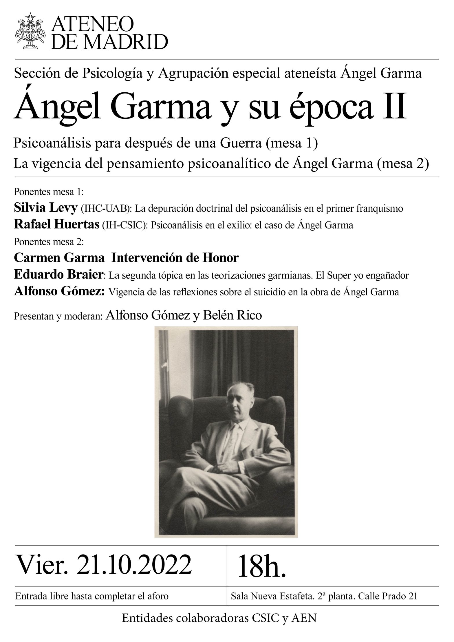 Agrupación Especial Ateneísta Ángel Garma y Sección de Psicología. Jornadas Psicoanalíticas. Psicoanálisis para después de una guerra. La depuración doctrinal del psicoanálisis en el primer franquismo. Interviene Silvia Lévy (IHC-UAB). Psicoanálisis en el exilio, Miguel Huertas Maestro (IH-CSIC). La reformulación institucional del psicoanálisis (Garma como figura puente en la formación del grupo psicoanalítico de Madrid) y Carmen Llor. La vigencia del pensamiento psicoanalítico de Ángel Garma Intervienen: Carmen Garma, Eduardo Brier y Alfonso Gómez Prieto. Presenta y modera Belén Rico. Sala Nueva Estafeta. 18 h.