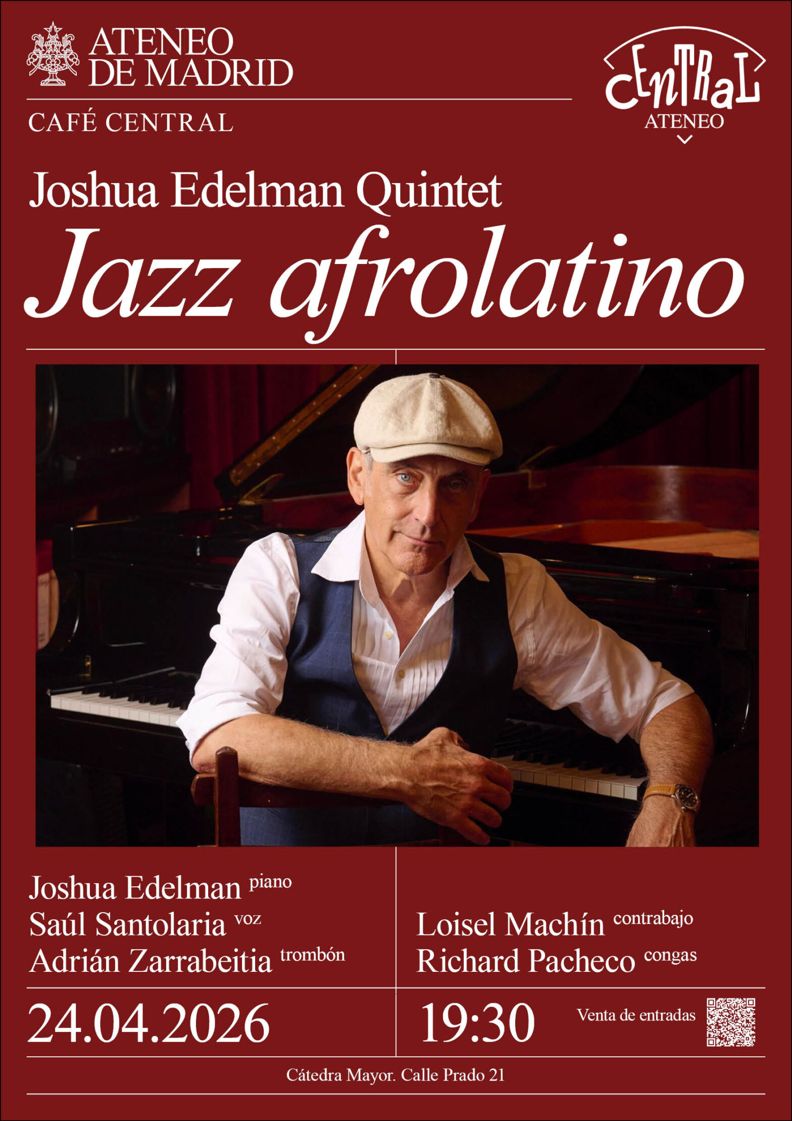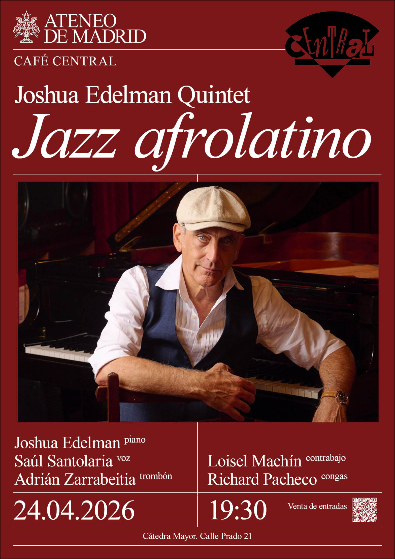 “Tengo una larguísima historia de amor con el jazz latino que se me contagió en mi Manhattan natal en los años setenta. La pasión por esta música ha sido uno de los motores de mi vida profesional y me ha llevado a realizar, durante décadas, una intensa actividad de grabaciones y conciertos. Después de casi cuarenta años actuando asiduamente sobre el escenario del mítico Café Central para mí es una enorme alegría que el Central haya podido superar todas las adversidades para continuar en esta nueva sede. Y por supuesto un honor poder inaugurar esta nueva etapa con esta banda.” Joshua Edelman.