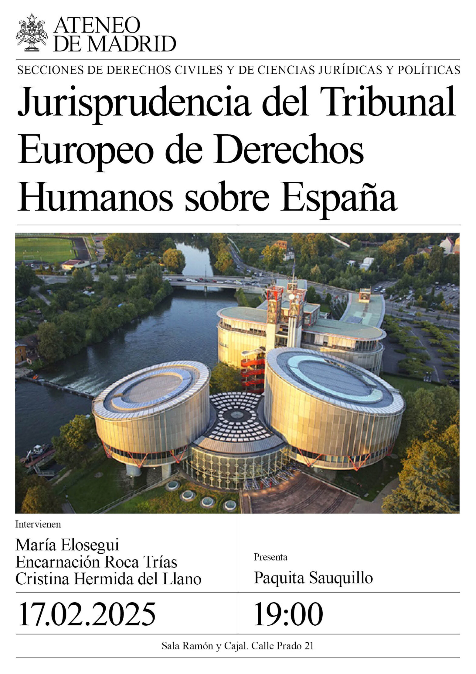 Secciones de Derechos Civiles y de Ciencias Jurídicas y Políticas. Intervienen: María Elosegui, representante de España en el Tribunal Europeo de Derechos Humanos; Encarnación Roca Trías, exmagistrada del Tribunal Constitucional; Cristina Hermida del Llano, catedrática de Filosofía del Derecho en la Universidad Rey Juan Carlos . Presenta: Paquita Sauquillo. Sala Ramón y Cajal. 19:00h.