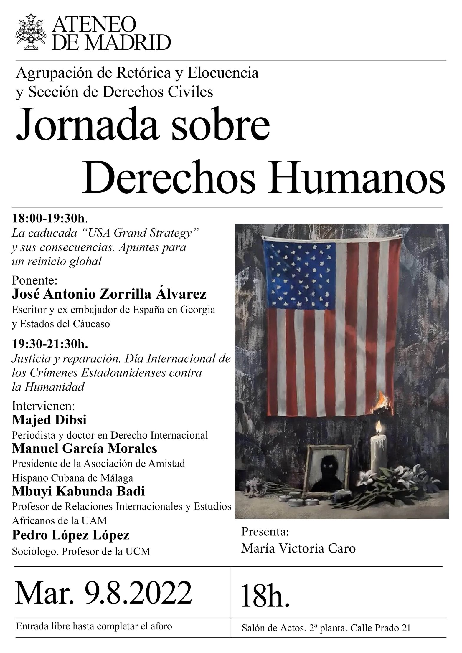 Agrupación de Retórica y Elocuencia y Sección de Derechos Civiles. 18:00-19:30h. Conferencia La caducada «USA Grand Estrategy» y sus consecuencias. Apuntes para un reinicio global. Ponente José Antonio Zorilla Álvarez. 19:30-21:30h. Mesa redonda Día Internacional de los Crímenes Estadounidenses contra la Humanidad Intervienen: Majed Dibsi, periodista y doctor en Derecho Internacional; Manuel García Morales, presidente de la Asociación Hispano Cubana de Málaga; Mbuyi Kabunda Badi, doctor y licenciado en Ciencias Políticas, profesor y miembro del Instituto Internacional de Derechos Humanos de Estrasburgo y profesor de Relaciones Internacionales y Estudios Africanos de la Universidad Autónoma de Madrid. Pedro López López, sociólogo, profesor de la Universidad Complutense. Presenta: María Victoria Caro. Salón de Actos.