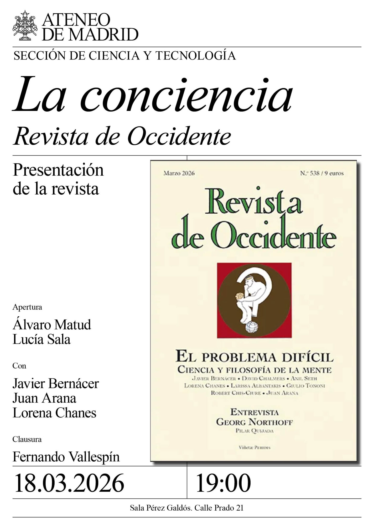 Sección de Ciencia y Tecnología. Apertura: Álvaro Matud y Lucía Sala, directora de la Fundación Ortega-Marañón. Con: Javier Bernácer, neurocientífico y filósofo, Centro Internacional de Neurociencia y Ética (CINET); Lorena Chanes, neurocientífica, Universidad Autónoma de Barcelona; Juan Arana, filósofo, Real Academia de Ciencias Morales y Políticas de Madrid. Clausura: Fernando Vallespín Oña, director de la Revista de Occidente. Sala Pérez Galdós. 19:00h.