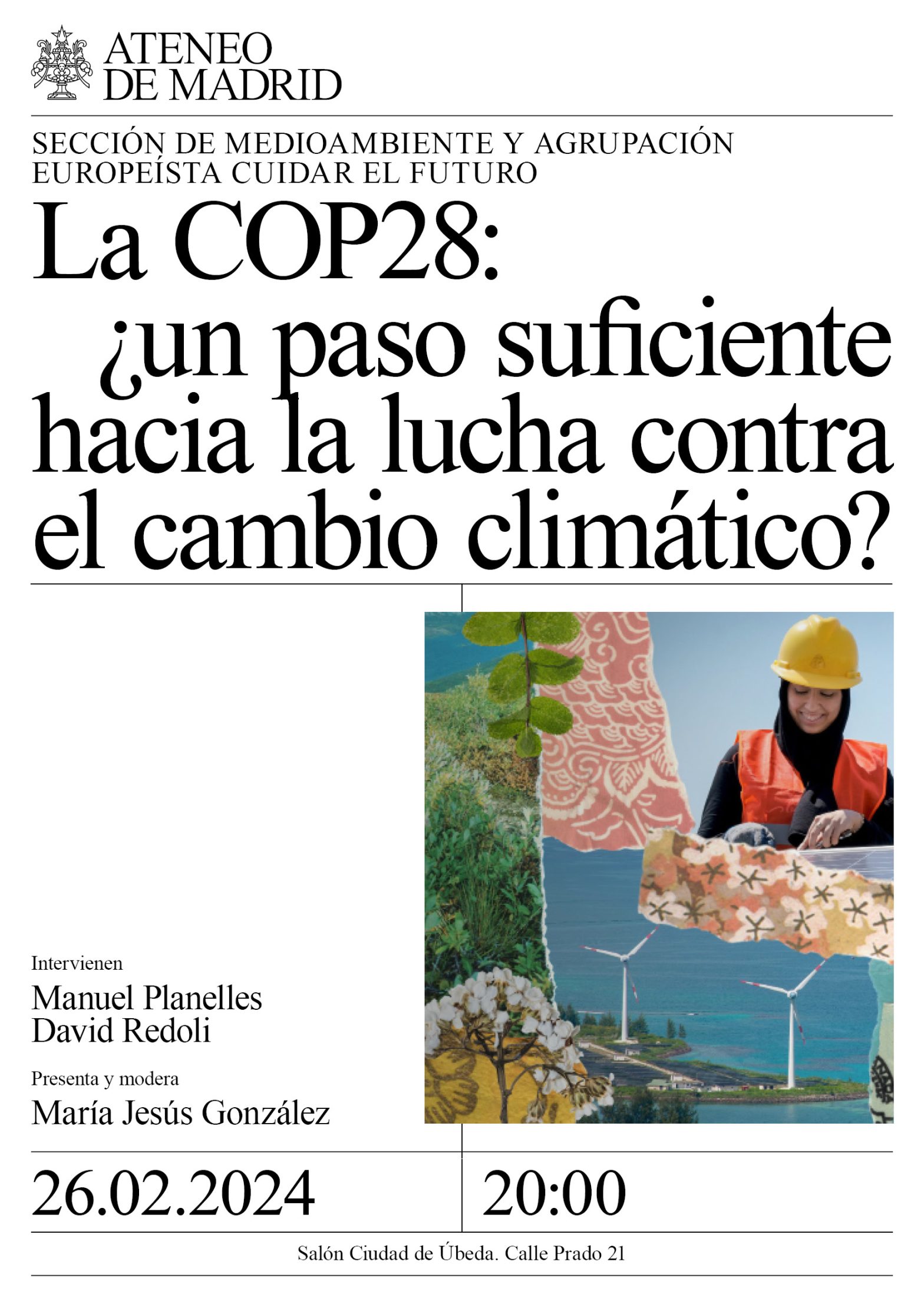 Sección de Medio Ambiente en colaboración con la Agrupación Europeísta. Intervienen: Manuel Planelles, asistente a la COP28, periodista de El País, especializado en cambio climático, medio ambiente y energía. David Redoli, asistente a la COP28, sociólogo. Presenta y modera: María Jesús González, presidenta de la Sección de Medio Ambiente. Salón Ciudad de Úbeda. 20:00h.