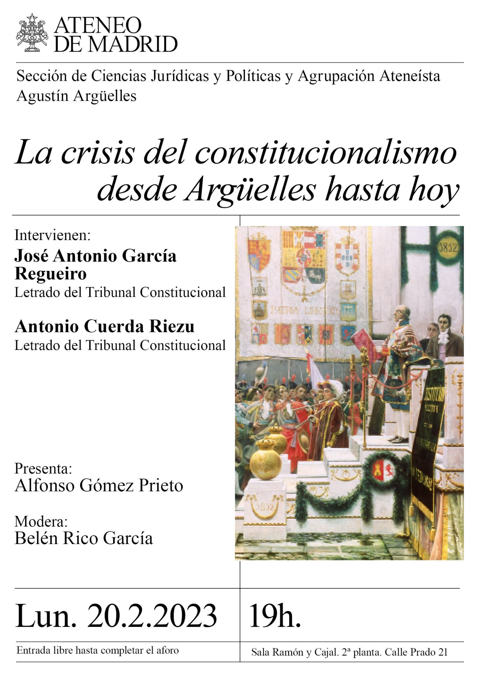 Sección de Ciencias Jurídicas y Agrupación Agustín Argüelles. Intervienen: José Antonio García Regueiro, letrado del Tribunal Constitucional; Antonio Cuerda Riezu, letrado del Tribunal Constitucional. Presenta: Alfonso Gómez Prieto. Modera: Belén Rico García. Sala Ramón y Cajal. 19h.