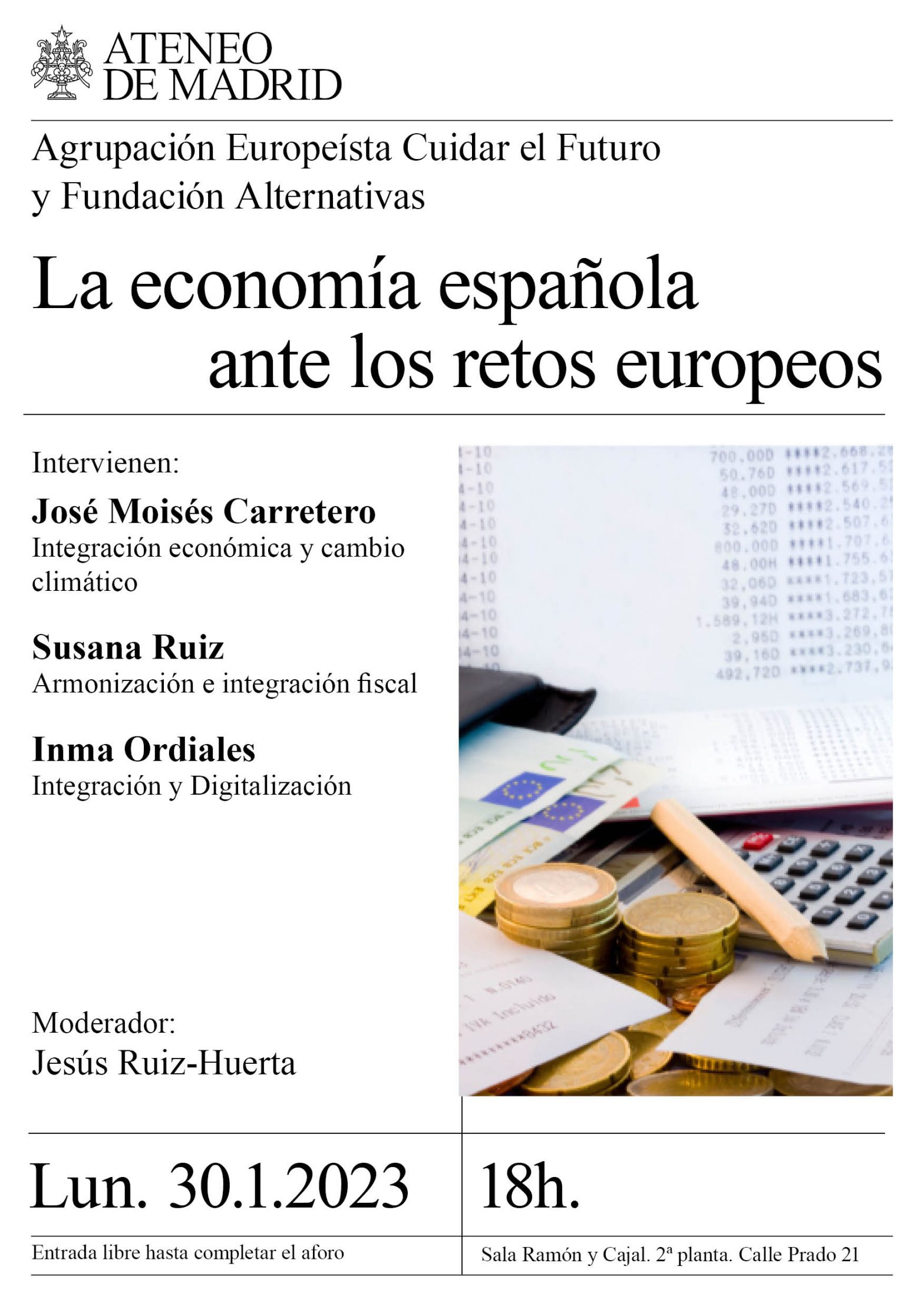 Agrupación europeísta «Cuidar el futuro» y Fundación Alternativas. Intervienen: José Moisés Carretero: Integración económica; Susana Ruiz: Armonización e integración fiscal y cambio climático; Inma Ordiales: Integración y Digitalización. Moderador: Jesús Ruiz-Huerta. Sala Ramón y Cajal. 18h.