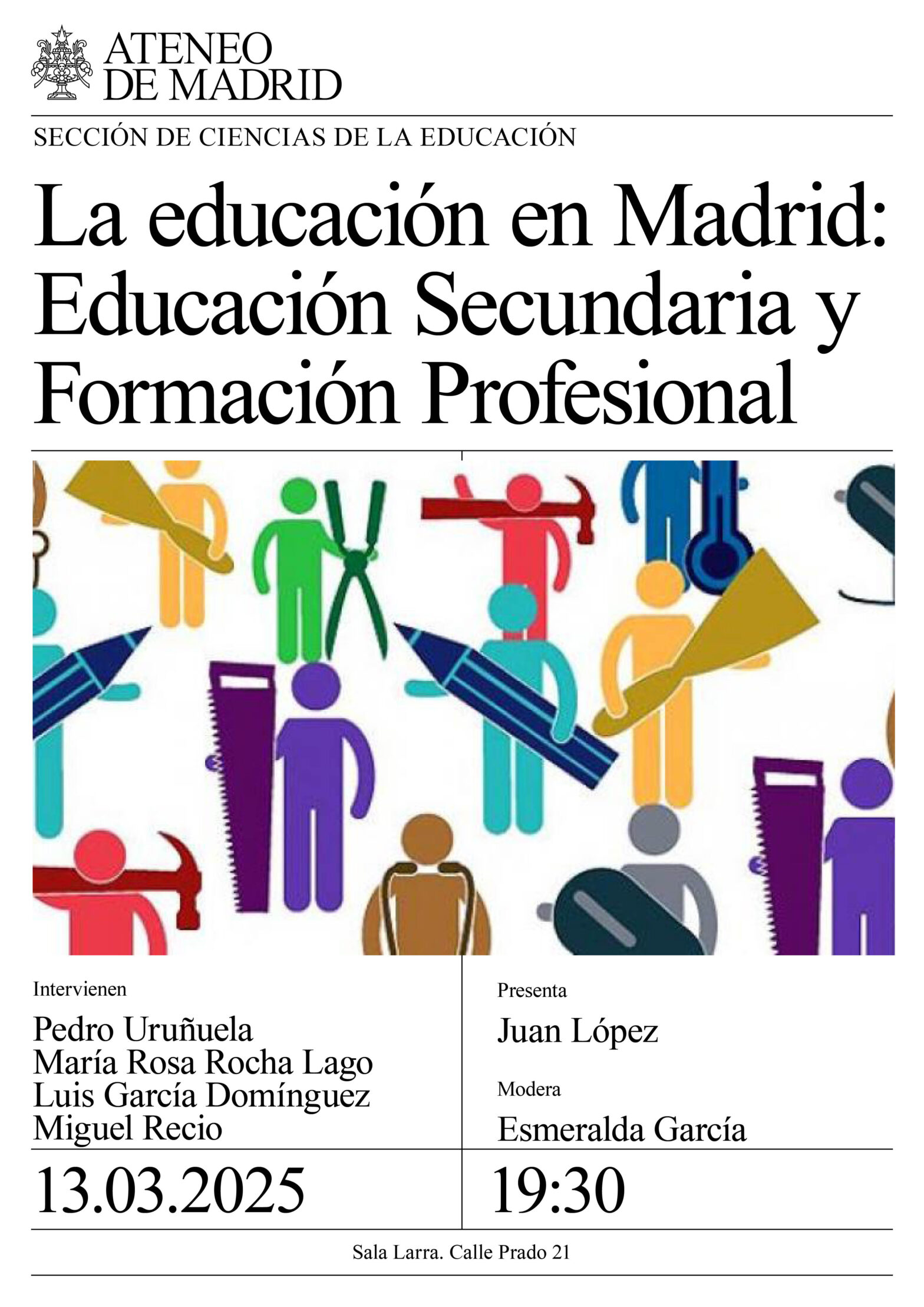 Sección de Ciencias de la Educación. Intervienen: Pedro Uruñuela, inspector de Educación; María Rosa Rocha Lago, presidenta de la Asociación de Directores de Madrid (ADIMAD); Luis García Domínguez, director del IES Puerta Bonita y presidente de FP empresa; y Miguel Recio, catedrático de instituto. Presenta Juan López. Modera Esmeralda García. Sala Larra. 19:30h.