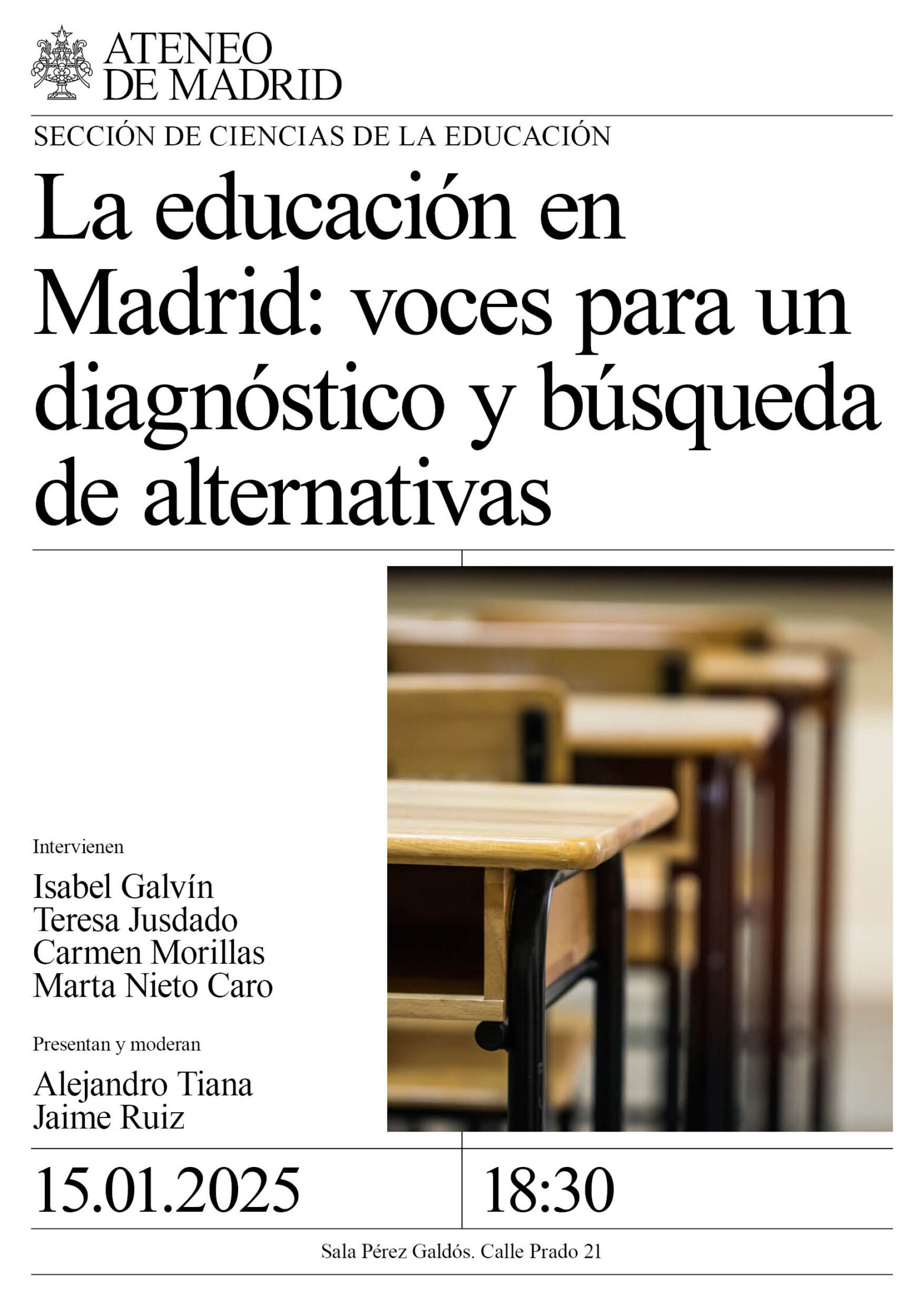 Sección de Ciencias de la Educación. Intervienen: Isabel Galvín, secretaria general de la Federación de Educación de CCOO de Madrid; Teresa Jusdado, secretaria general de la Federación de Educación de UGT/Servicios Públicos de Madrid; Carmen Morillas, presidenta de la Federación de Asociaciones de Padres y Madres del Alumnado «Francisco Giner de los Ríos» de la Comunidad de Madrid; y Marta Nieto Caro, miembro de la Federación de MRP de Madrid. Presentan y moderan: Alejandro Tiana y Jaime Ruiz. Sala Pérez Galdós. 18:30h.
