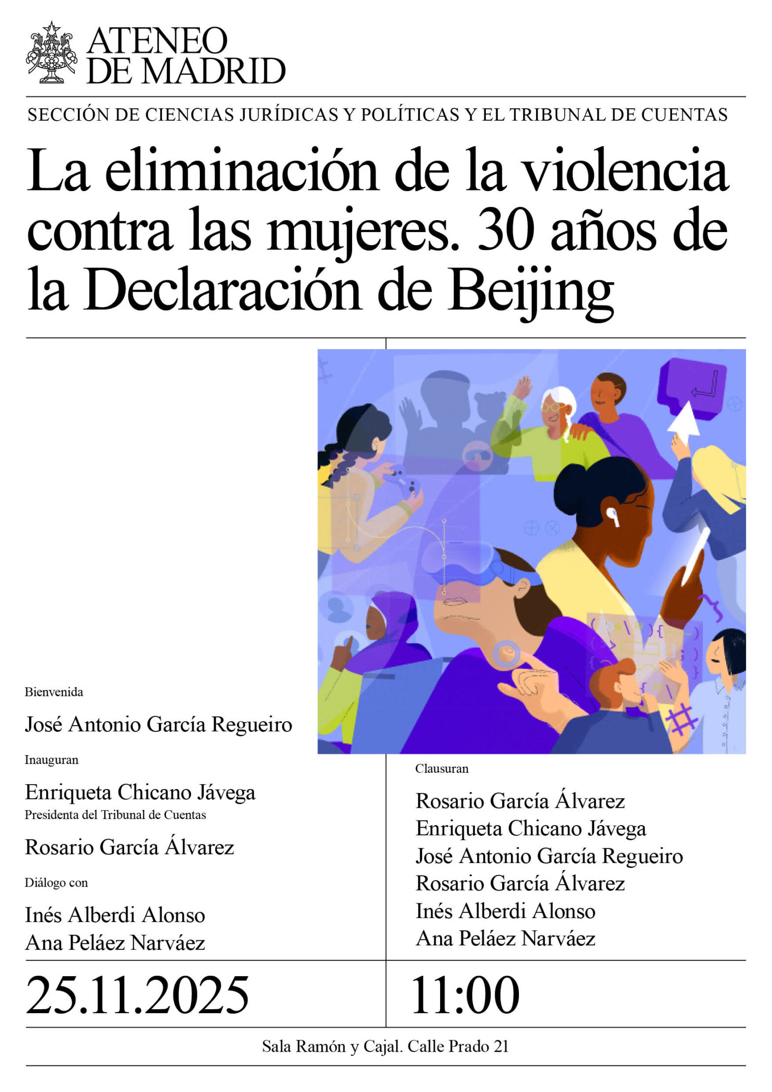 Sección de Ciencias Jurídicas y Políticas y el Tribunal de Cuentas. Bienvenida: José Antonio García Regueiro. Inauguran: Enriqueta Chicano Jávega, presidenta del Tribunal de Cuentas y Rosario García Álvarez. Diálogo con: Inés Alberdi Alonson y Ana Peláez Narváez, Clausuran: Rosario García Álvarez, Enriqueta Chicano Jávega, José Antonio García Regueiro, Rosario García Álvarez, Inés Alberdi Alonso y Ana Peláez Narváez. Sala Ramón y Cajal. 11:00h.