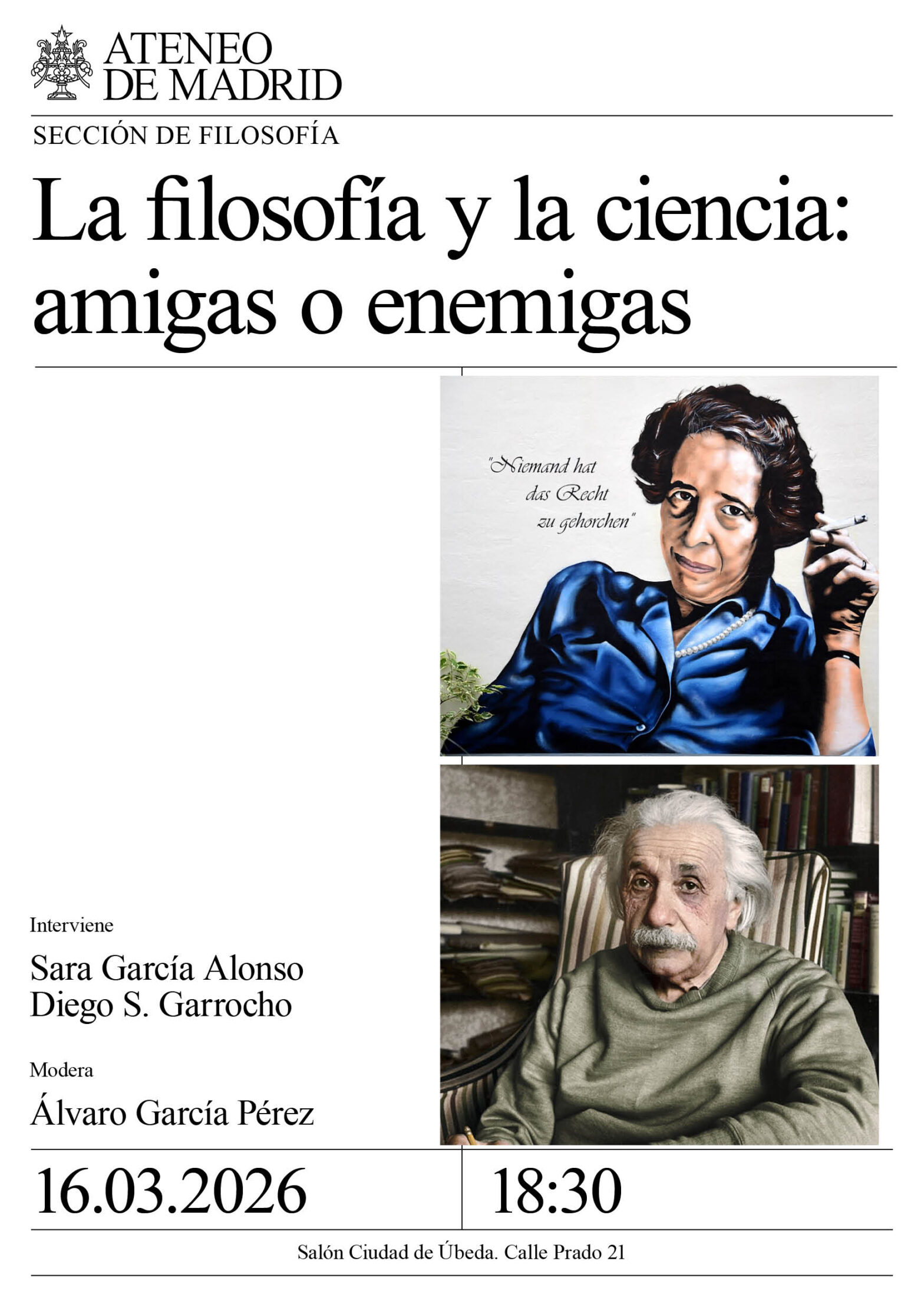 Sección de Filosofía. Intervienen: Sara García Alonso, bióloga molecular y astronauta y Diego S. Garrocho, filosofo. Modera: Álvaro García Pérez. Salón Ciudad de Úbeda. 18:30h.