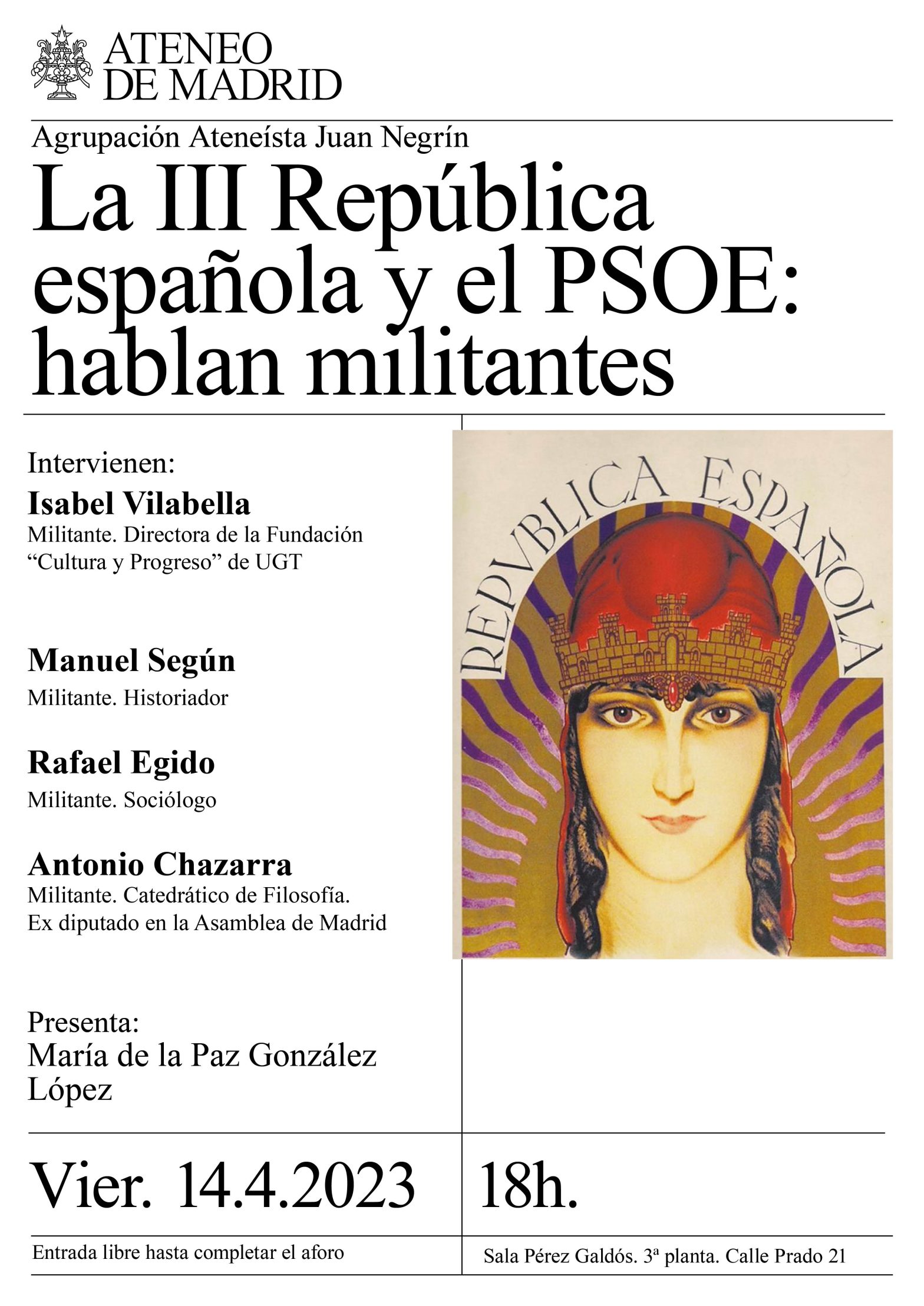 Agrupación Ateneísta Juan Negrín. Intervienen: Isabel Vilabella, militante, directora de la Fundación “Progreso y Cultura” de UGT; Manuel Según, militante e historiador; Rafael Egido, militante y sociólogo; Antonio Chazarra, militante, catedrático de Filosofía y ex diputado en la Asamblea de Madrid. Presenta: María de la Paz González López. Sala Pérez Galdós. 18h.