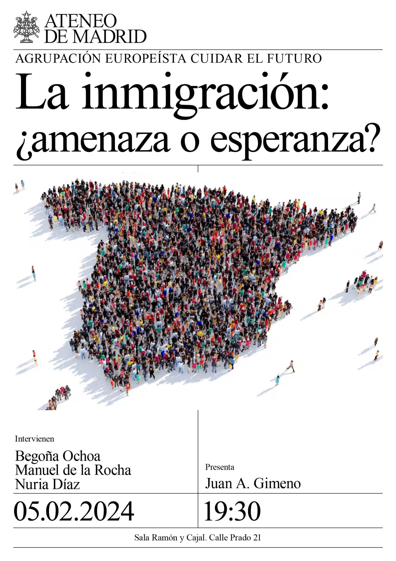 Agrupación Europeísta Cuidar el Futuro. Intervienen: Begoña Ochoa, diplomática – subdirectora adjunta (Pacto de Migración y Asilo) Ministerio de Asuntos Exteriores, España. Manuel de la Rocha, presidente de Movimiento por la Paz, abogado, exconsejero del Consejo Económico y Social de España a propuesta de UGT. Nuria Díaz, coordinadora estatal de incidencia de CEAR. Presenta: Juan A. Gimeno, exrector de la UNED. Sala Ramón y Cajal. 19:30h.