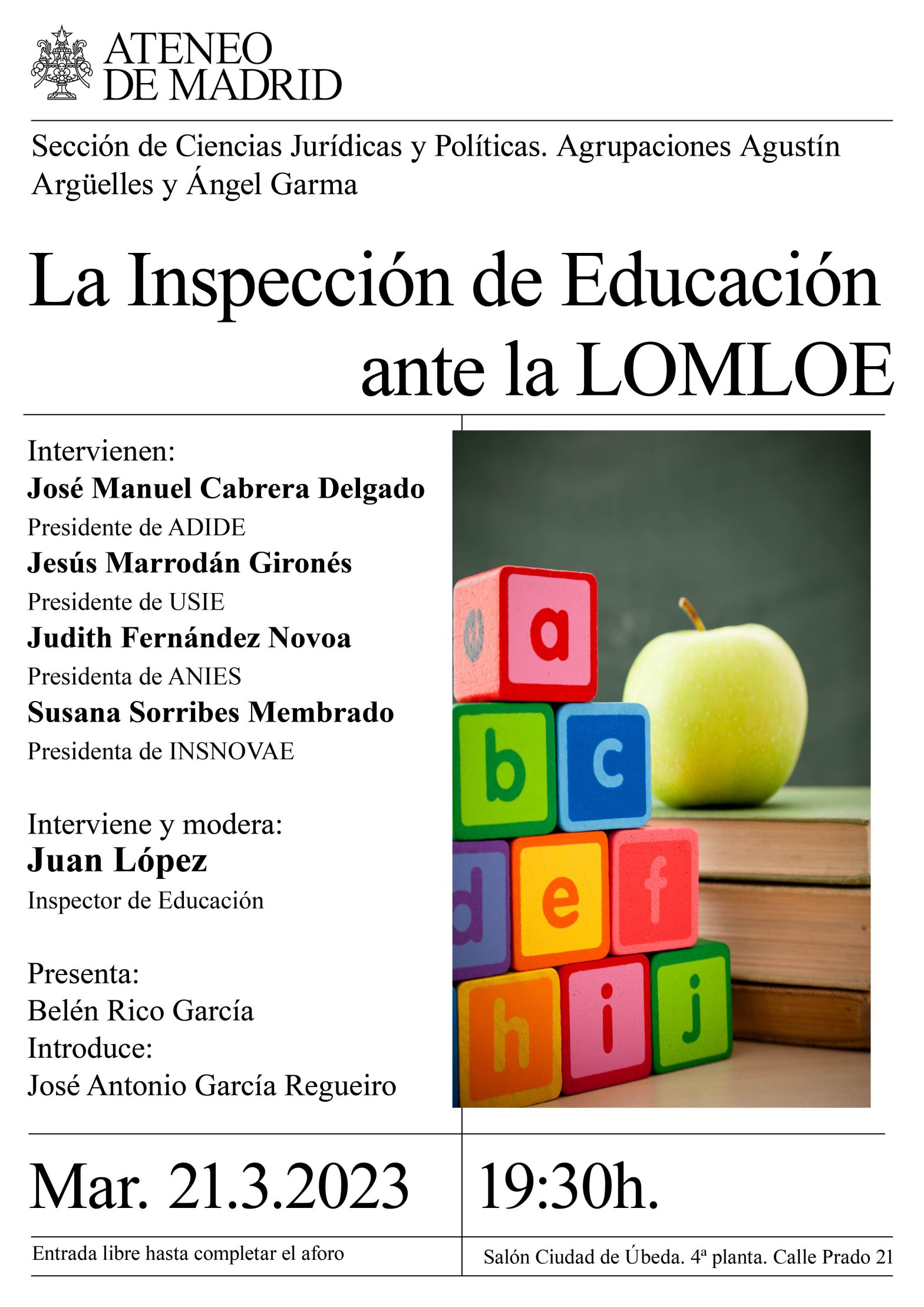 Sección de Ciencias Jurídicas y Políticas. Agrupaciones Agustín Argüelles y Ángel Garma. Intervienen: José Manuel Cabrera Delgado, presidente de ADIDE; Jesús Marrodán Gironés, presidente de USIE; Judith Fernández Novoa, presidenta de ANIES; Susana Sorribes Membrado, presidenta de INSNOVAE. Presenta: Belén Rico García. Introduce: José Antonio García Regueiro. Interviene y modera: Juan López, inspector de Educación. Salón Ciudad de Úbeda. 19:30h.