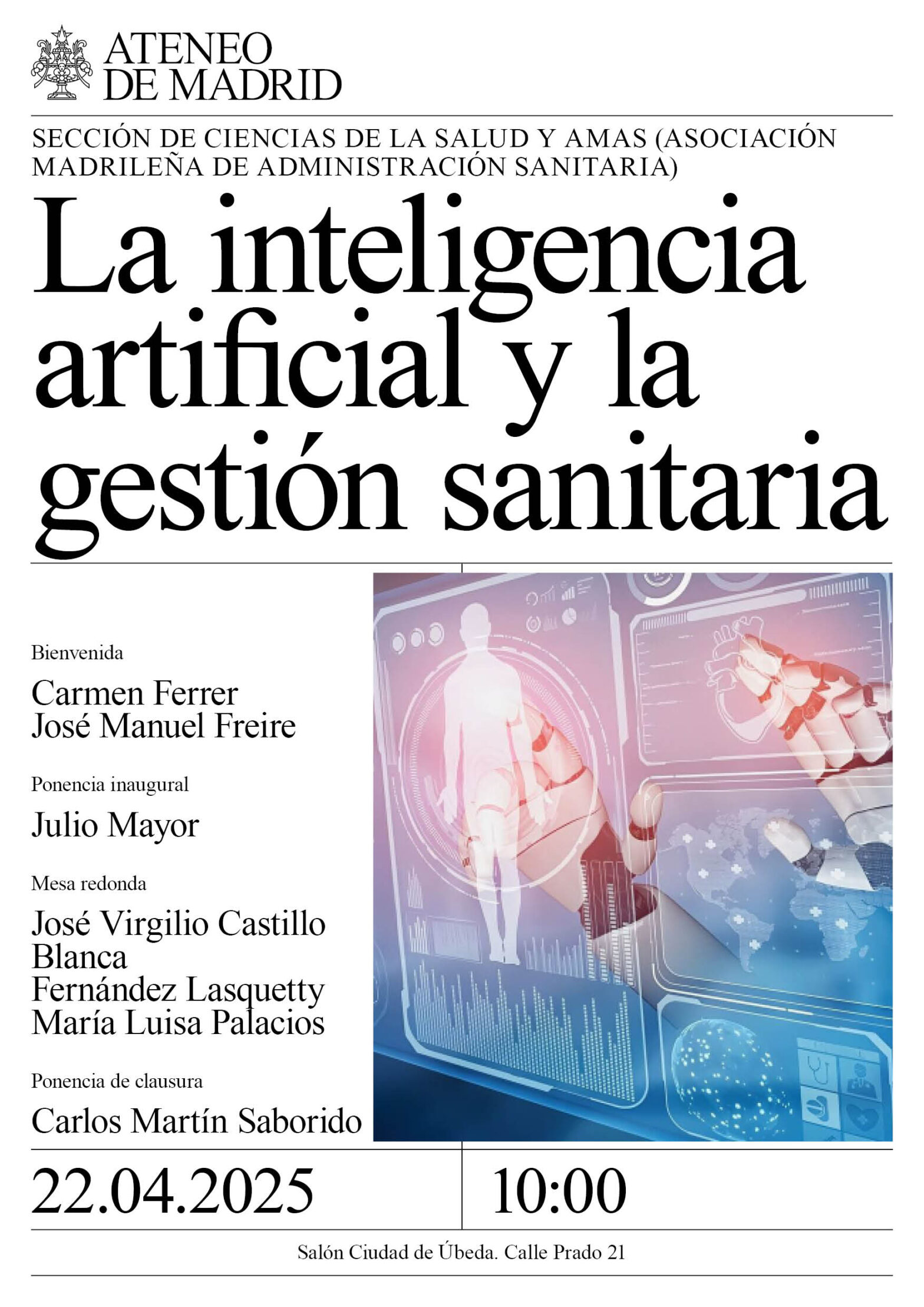 Sección de Ciencias de la Salud y AMAS (Asociación Madrileña de Administración Sanitaria). Bienvenida: Carmen Ferrer y José Manuel Freire. Ponencia inaugural Julio Mayor, Instituto de Investigación, Hospital Clínico. Mesa redonda: José Virgilio Castillo, director médico del Hospital Fundación Alcorcón; Blanca Fernández Lasquetty, secretaria de ANDE. Asociación de Directivos de Enfermería; y María Luisa Palacios, directora de Continuidad Asistencial, Hospital Ramón y Cajal. Ponencia de clausura Carlos Martín Saborido, Instituto de Salud Carlos III. Salón Ciudad de Úbeda. 10:00h.