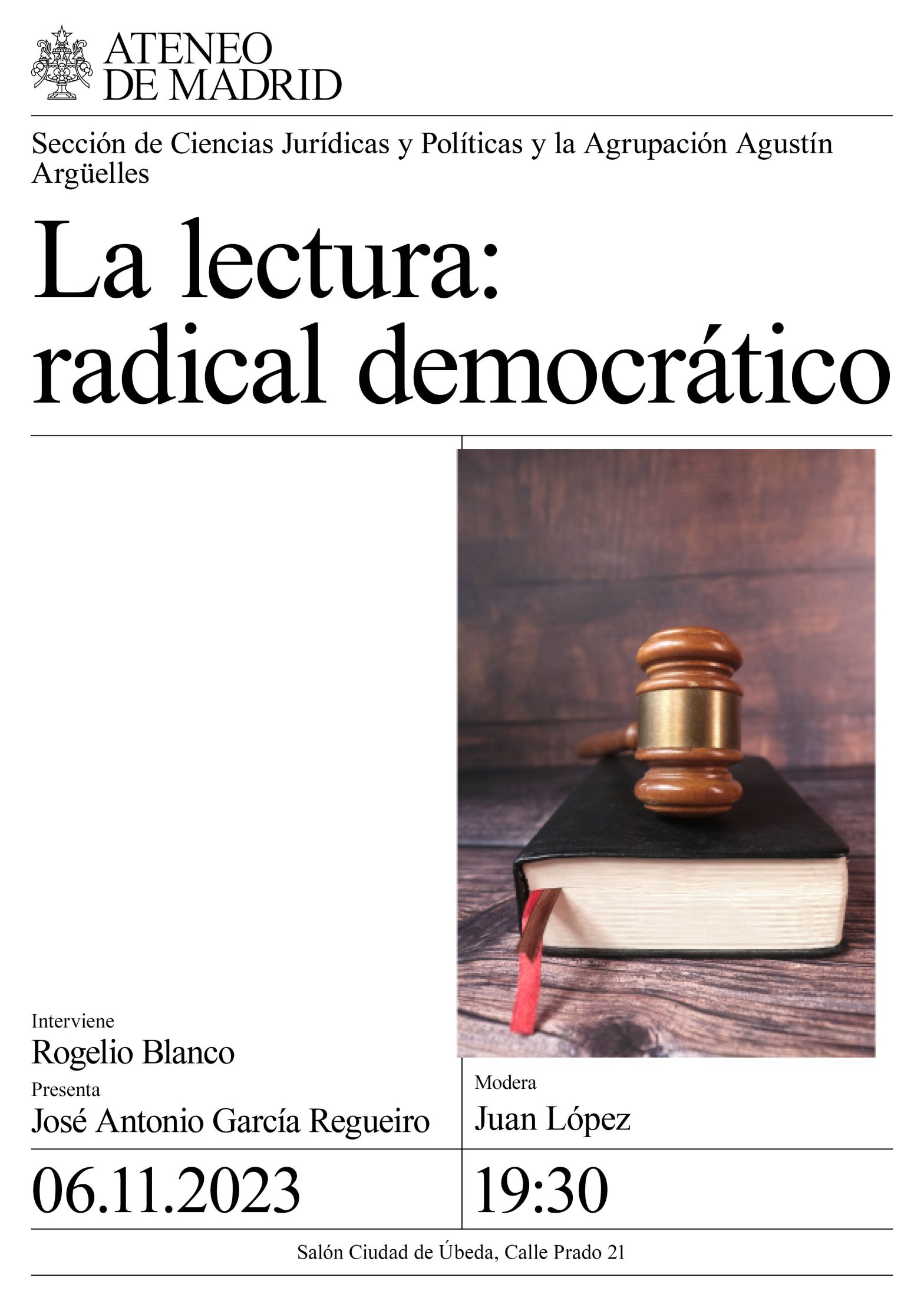 Sección de Ciencias Jurídicas y Políticas y la Agrupación Agustín Argüelles. Ponente: Rogelio Blanco, director general del Libro, Archivos y Bibliotecas (2004/2011) y presidente de la Asociación Colegiada de Escritores de España (ACE) (2014/2018). Presenta: José Antonio García Regueiro. Modera: Juan López. Salón Ciudad de Úbeda. 19:30h.