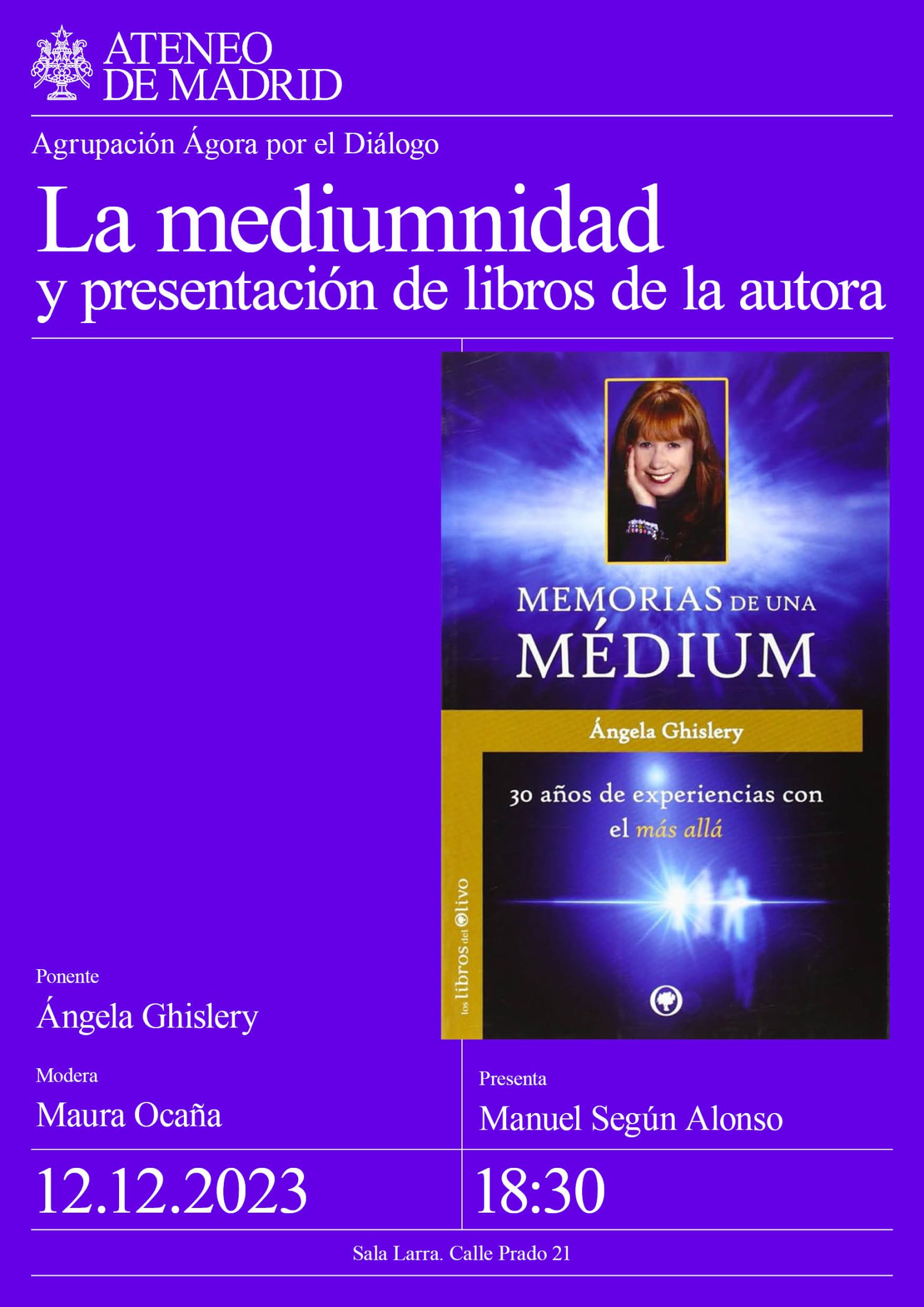 Agrupación Ágora por el Diálogo. Ponente: Ángela Ghislery escritora y medium Presenta: Manuel Según Alonso. Modera: Maura Ocaña. Sala Larra. 18:30h.
