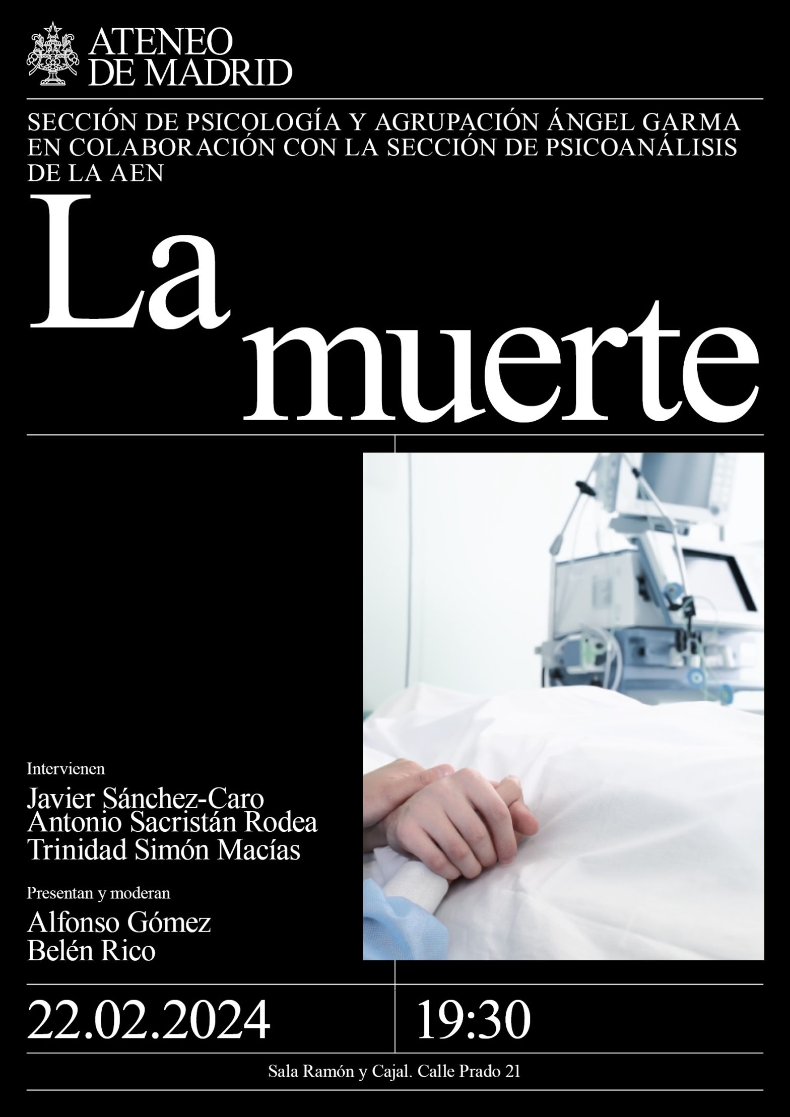 Sección de Psicología y Agrupación Ángel Garma en colaboración con la Sección de Psicoanálisis de la AEN. Intervienen: Javier Sánchez-Caro, Antonio Sacristán Rodea, médico oncólogo e intensivista y Trinidad Simón Macías, psicóloga y psicoanalista. Presentan y moderan: Alfonso Gómez y Belén Rico. Sala Ramón y Cajal. 19:30h.