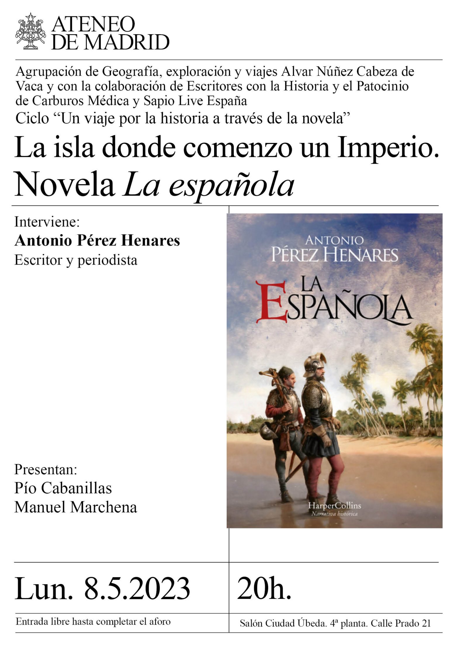 Agrupación de Geografía, exploración y viajes Alvar Núñez Cabeza de Vaca y con la colaboración de Escritores con la Historia y el Patocinio de Carburos Médica y Sapio Live España. Ciclo “Un viaje por la historia a través de la novela”. Intervienen: Antonio Pérez Henares, escritor y periodista. Presentan: Pío Cabanillas y Manuel Marchena. Sala Úbeda. 19h.