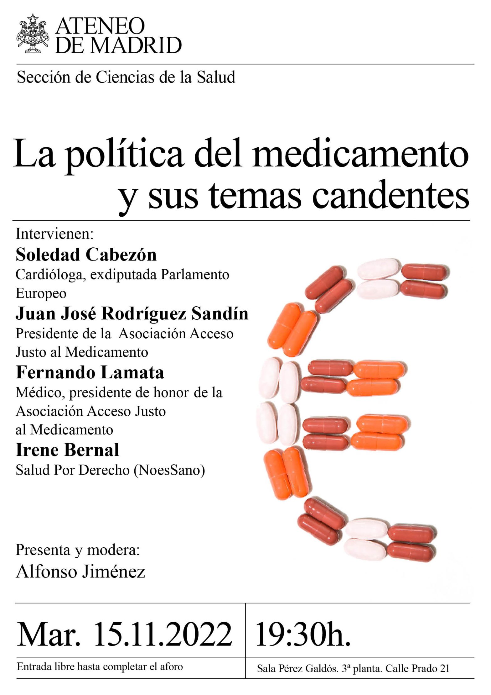Sección de Ciencias de la Salud. La política del medicamento y sus temas candentes. Intervienen: Patricia Lacruz, DG de Farmacia DG de Farmacia, Ministerio de Sanidad (PC), Juan Jose Rodriguez Sendin, presidente, presidente de la AAJM, Fernando Lamata Cotanda, pte. de honor, AAJM, Soledad Cabezón, cardióloga, ex diputada Parlamento Europeo (PC). Presenta José-Manuel Freire. Modera Eva Iraizoz, NoEsSano (PC). Sala Pérez Galdós. 19.30 h.