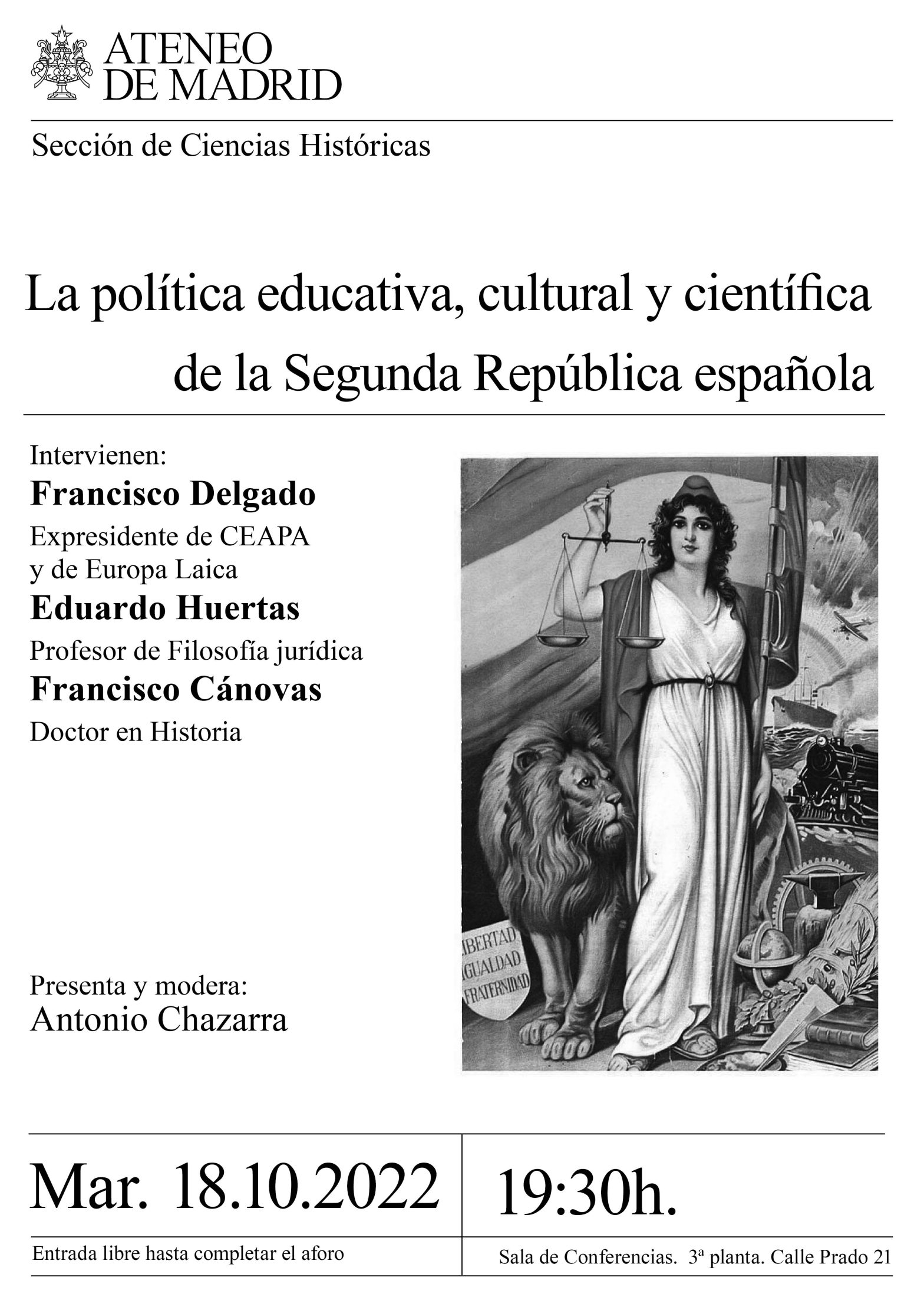 Sección de Ciencias Históricas. Intervienen: Francisco Delgado, expresidente de CEAPA y de Europa Laica, Eduardo Huertas, profesor de Filosofía jurídica, Francisco Cánovas, doctor en Historia. Presenta y modera Antonio Chazarra. Sala de Conferencias.19.30 h.
