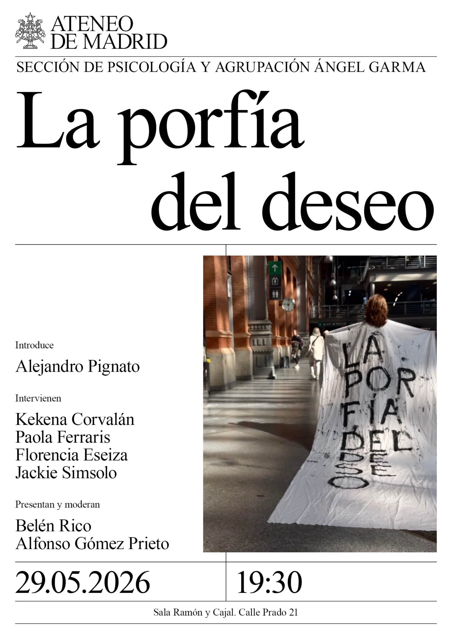 Sección de Psicología y Agrupación Ángel Garma. Introduce: Alejandro Pignato. Ponentes: Kekena Corvalán y Paola Ferraris, Florencia Eseiza y Jackie Simsolo. Presenta y modera: Belén Rico y Alfonso Gómez. Sala Ramón y Cajal. 19:30.