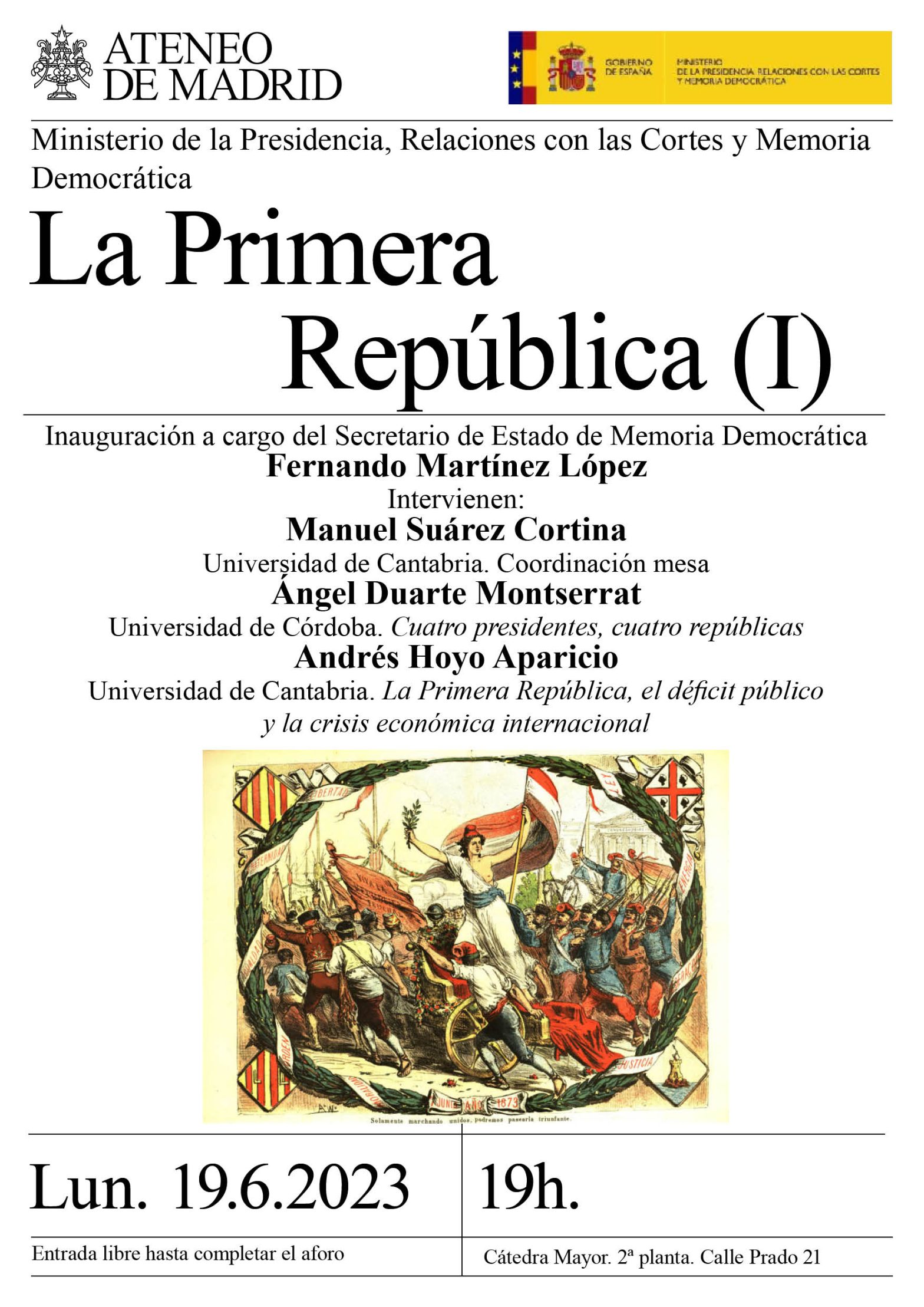 Ángel Duarte Montserrat, Universidad de Córdoba. Cuatro presidentes, cuatro repúblicas; Andrés Hoyo Aparicio, Universidad de Cantabria. La Primera República, el déficit público y la crisis económica internacional. Cátedra Mayor. 19h.