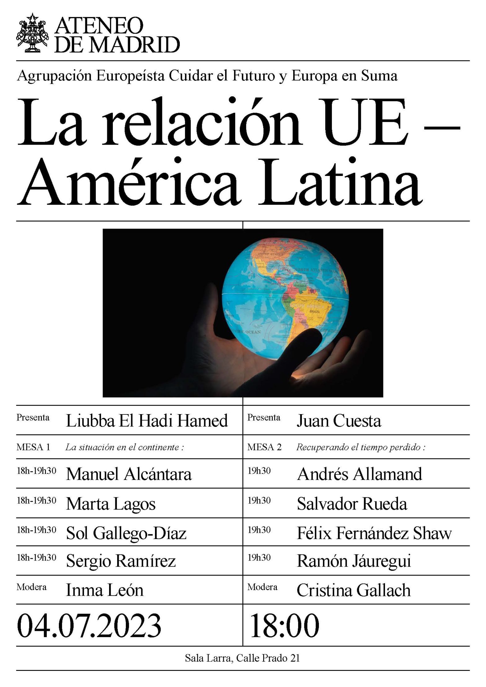 Agrupación Europeísta Cuidar el Futuro y Europa en Suma. Presentan: Liubba El Hadi Hamed y Juan Cuesta. Mesa 1.- 18-19:30h. La situación en el continente, con Manuel Alcántara, director del Instituto Iberoamericano, Universidad Salamanca; Sol Gallego-Díaz, ex directora El País y El País América; Marta Lagos, directora del Latinobarómetro; y Sergio Ramírez, escritor. Modera: Inma León.